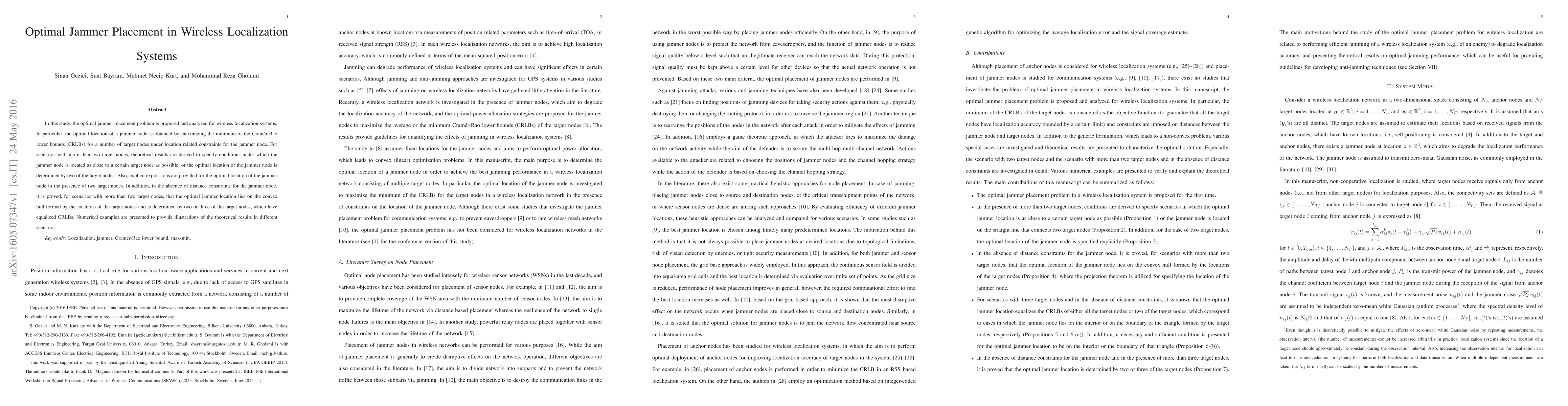 This paper investigates the optimal placement of a jammer in wireless localization systems to maximize the minimum Cramer-Rao lower bounds for target nodes, deriving theoretical conditions and expressions for jammer placement under various constraints and scenarios, and validating results with numerical examples.