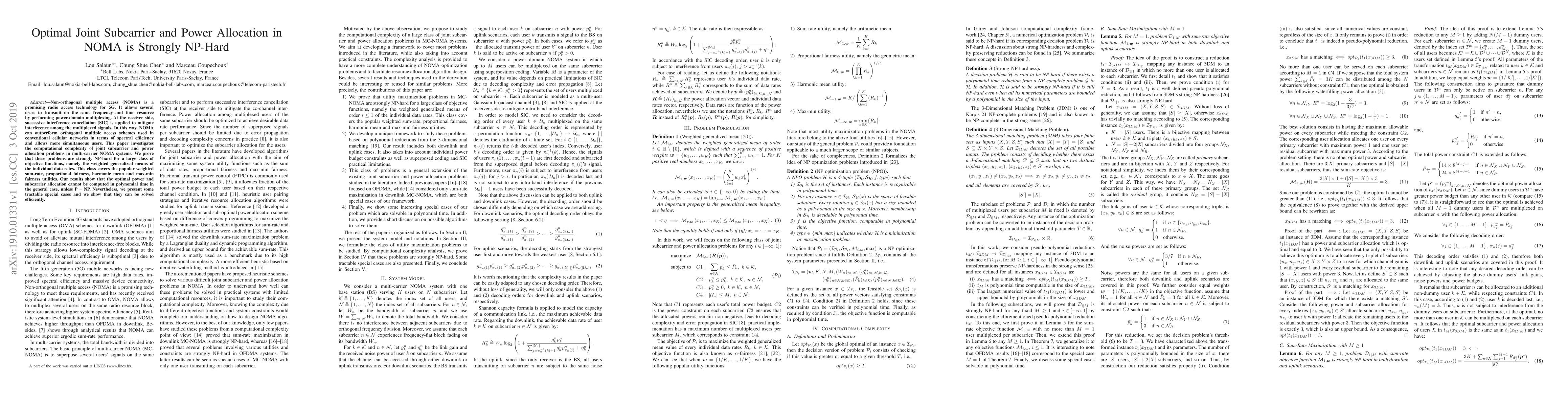 This paper proves that optimal joint subcarrier and power allocation in multi-carrier NOMA systems is strongly NP-hard for various objective functions, including weighted sum-rate and fairness metrics. Despite the computational complexity, it identifies tractable special cases that can be solved efficiently.