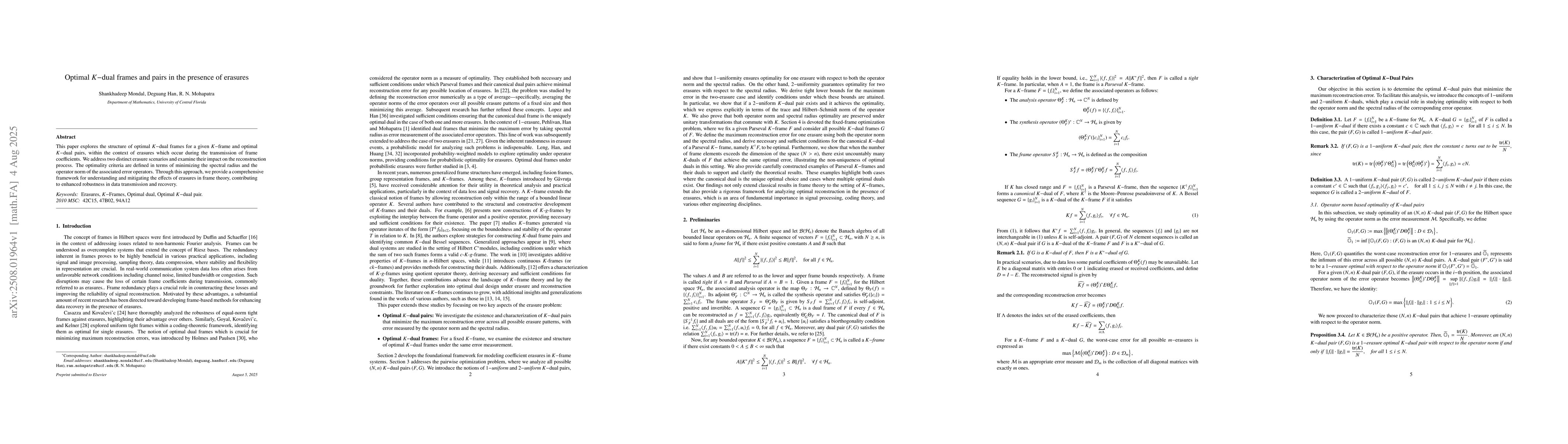 This paper explores the structure of optimal K-dual frames for a given K-frame and optimal K-dual pairs, within the context of erasures which occur during the transmission of frame coefficients. We address two distinct erasure scenarios and examine their impact on the reconstruction process. The optimality criteria are defined in terms of minimizing the spectral radius and the operator norm of the associated error operators. Through this approach, we provide a comprehensive framework for understanding and mitigating the effects of erasures in frame theory, contributing to enhanced robustness in data transmission and recovery.