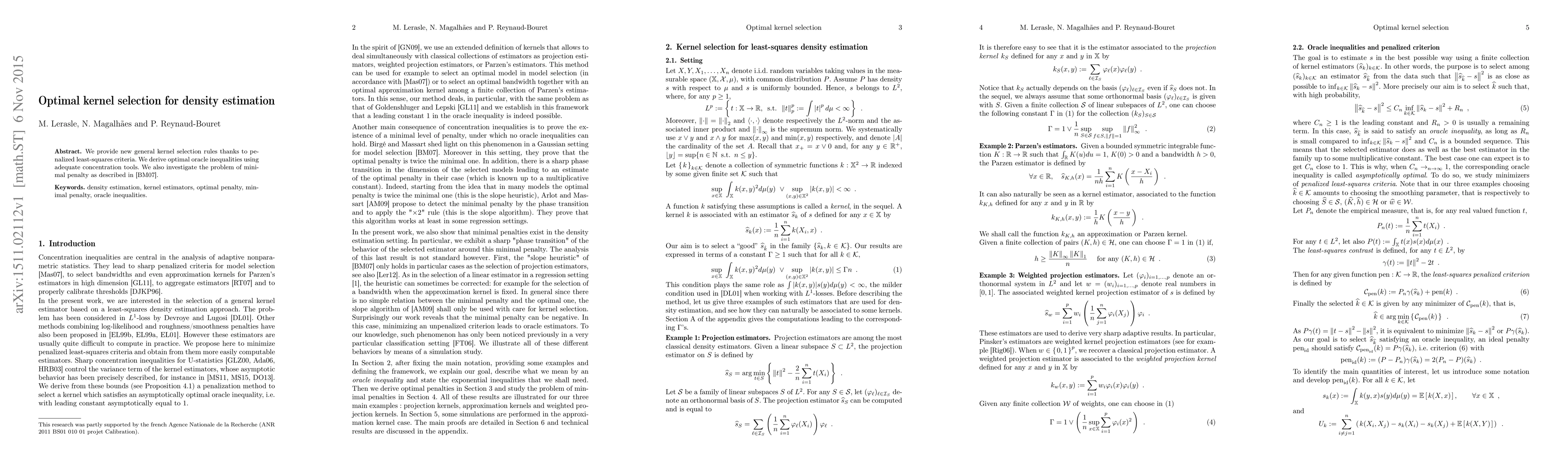 Summary: This paper introduces new kernel selection rules for density estimation based on penalized least-squares criteria, deriving optimal oracle inequalities and exploring the minimal penalty problem as outlined in [BM07]. The methodology employs advanced concentration tools for improved accuracy.
