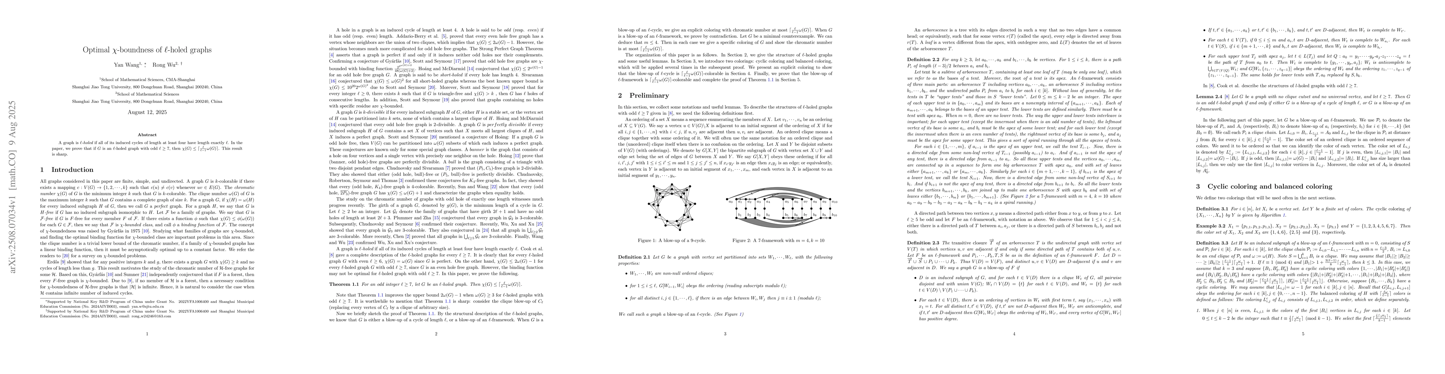 A graph is {\em{$\ell$-holed}} if all of its induced cycles of length at least four have length exactly $\ell$. In the paper, we prove that if $G$ is an $\ell$-holed graph with odd $\ell\geq 7$, then $\chi(G)\leq {\lceil {\ell \over {\ell-1}}\omega(G) \rceil}$. This result is sharp.