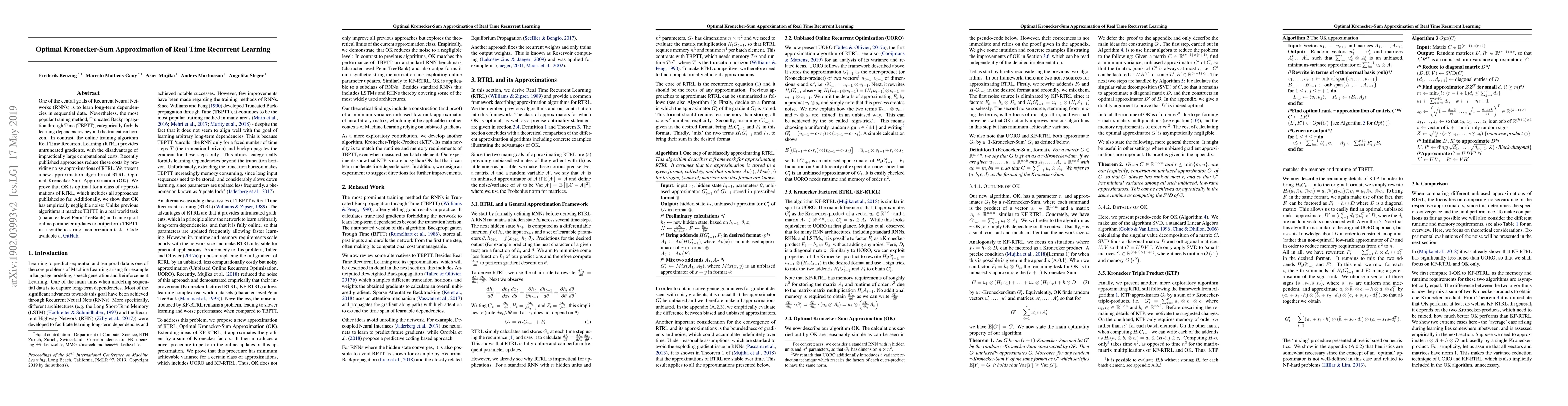 This paper introduces Optimal Kronecker-Sum Approximation (OK) for Real Time Recurrent Learning (RTRL), proving its optimality for a class of RTRL approximations and demonstrating negligible noise compared to previous methods. OK outperforms Truncated Backpropagation through Time (TBPTT) in both real and synthetic tasks.
