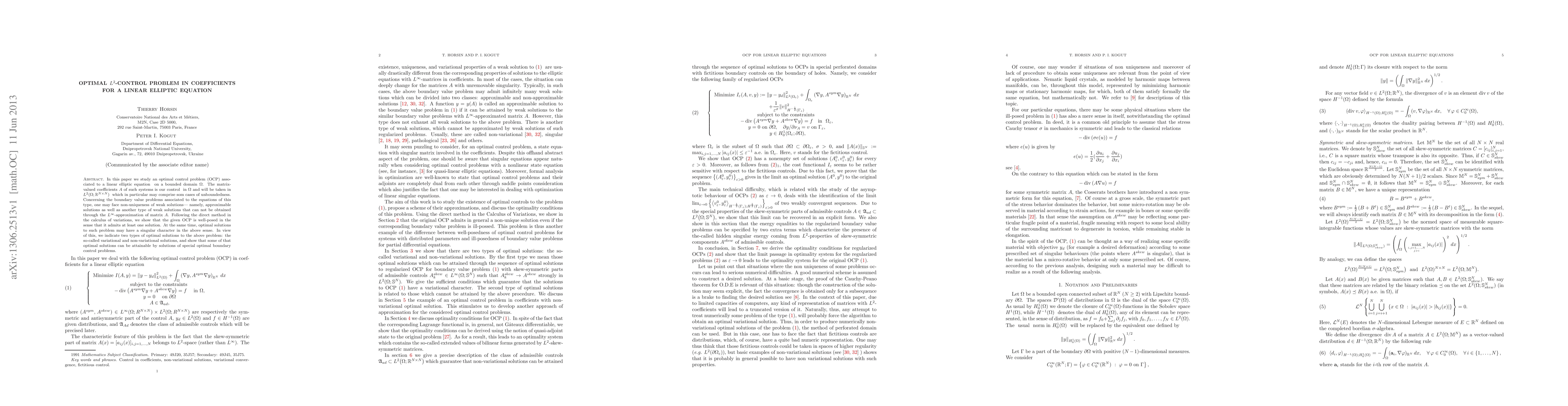 In this paper we study an optimal control problem (OCP) associated to a linear elliptic equation {on a bounded domain $\Omega$}. The matrix-valued coefficients A of such systems is our control taken in L2 which in particular may comprise som cases of unboundedness. Concerning the boundary value problems associated to the equations of this type, one may face non-uniqueness of weak solutions--- namely, approximable solutions as well as another type of weak solutions that can not be obtained through the bouded-approximation of matrix A. Following the direct method in the calculus of variations, we show that the given OCP is well-posed in the sense that it admits at least one solution. At the same time, optimal solutions to such problem may have a singular character in the above sense. In view of this, we indicate two types of optimal solutions to the above problem: the so-called variational and non-variational solutions, and show that some of that optimal solutions can be attainable by solutions of special optimal boundary control problems.