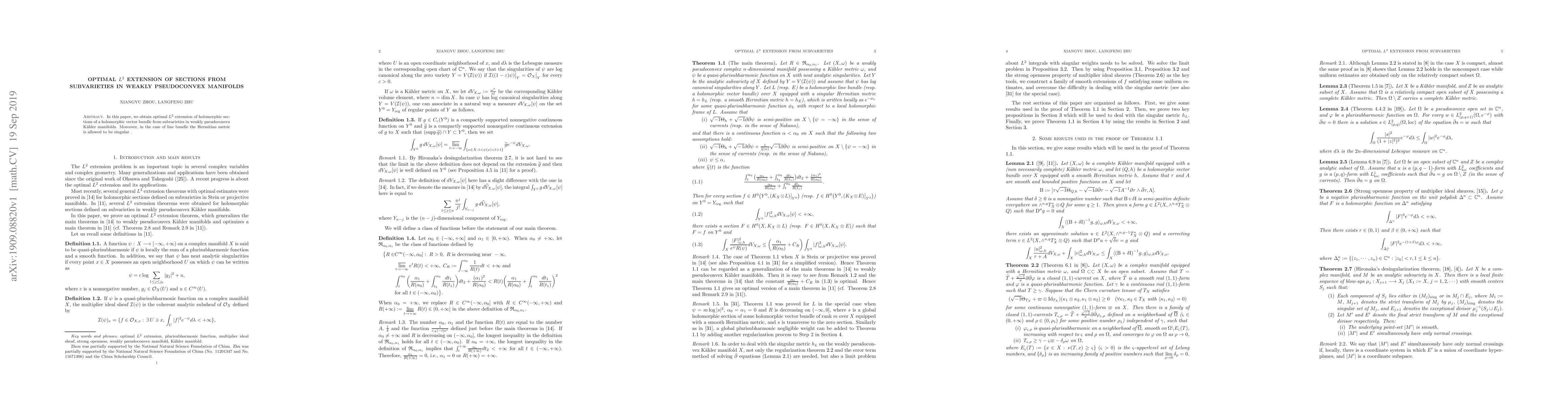 This paper presents optimal $L^2$ extension techniques for holomorphic sections from subvarieties in weakly pseudoconvex Kähler manifolds, even when the Hermitian metric on line bundles is singular. The results are significant for extending local properties to global contexts in complex geometry.