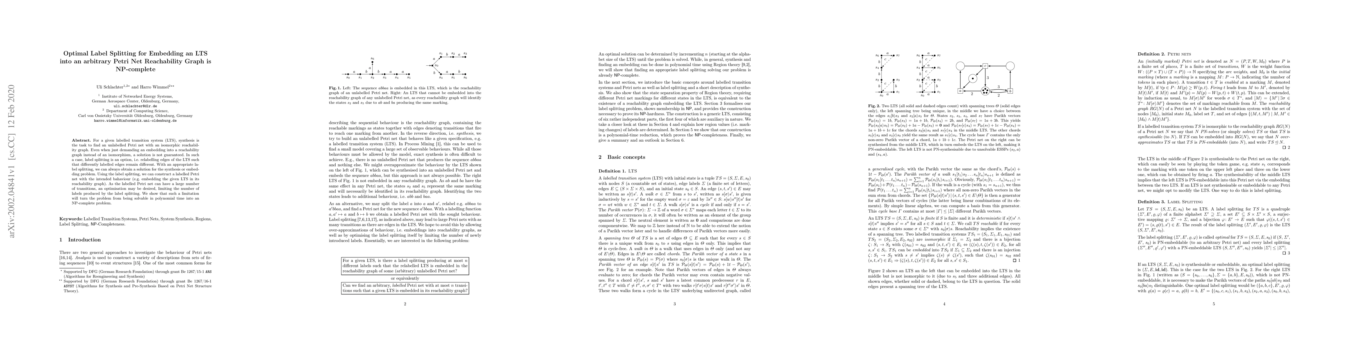 This paper explores optimal label splitting techniques for embedding a labelled transition system (LTS) into an arbitrary Petri net's reachability graph, demonstrating that limiting the number of labels produced by splitting transforms the problem from polynomial-time solvable to NP-complete. The method ensures the embedding while maintaining distinct labels for differently labelled edges.