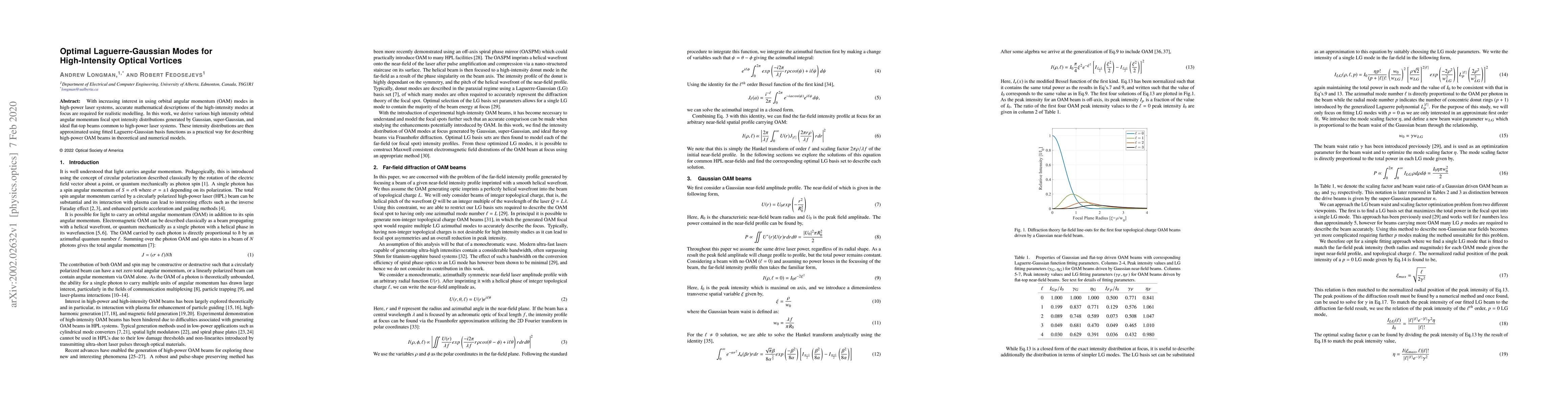 This paper derives high-intensity orbital angular momentum focal spot distributions from Gaussian, super-Gaussian, and flat-top beams using Laguerre-Gaussian modes for accurate modeling in high-power laser systems. The study approximates these distributions using fitted Laguerre-Gaussian basis functions for practical theoretical and numerical applications.