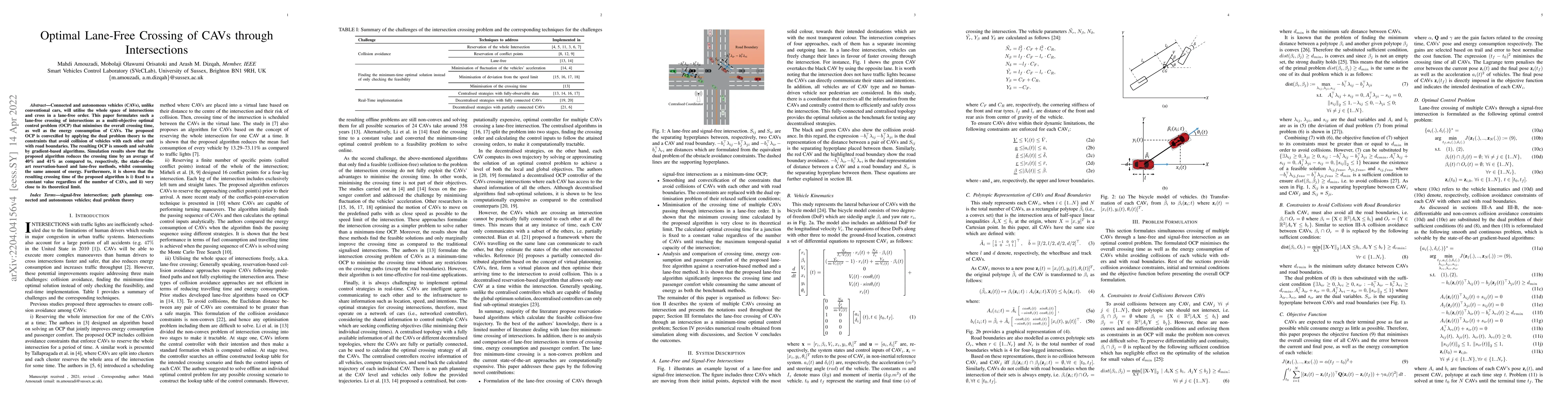 Connected and autonomous vehicles (CAVs), unlike conventional cars, will utilise the whole space of intersections and cross in a lane-free order. This paper formulates such a lane-free crossing of intersections as a multi-objective optimal control problem (OCP) that minimises the overall crossing time, as well as the energy consumption of CAVs. The proposed OCP is convexified by applying the dual problem theory to the constraints that avoid collision of vehicles with each other and with road boundaries. The resulting OCP is smooth and solvable by gradient-based algorithms. Simulation results show that the proposed algorithm reduces the crossing time by an average of 40% and 41% as compared to, respectively, the state-of-the-art reservation-based and lane-free methods, whilst consuming the same amount of energy. Furthermore, it is shown that the resulting crossing time of the proposed algorithm is i) fixed to a constant value regardless of the number of CAVs, and ii) very close to its theoretical limit.