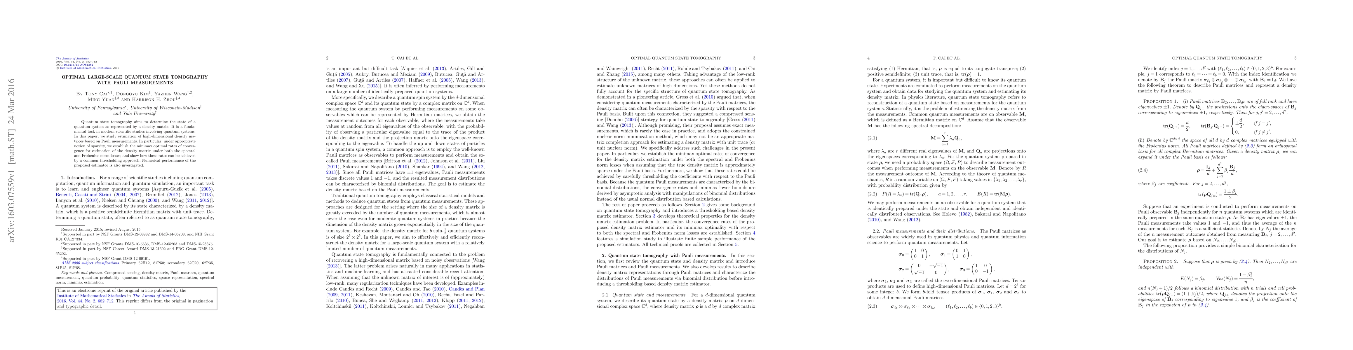 This paper investigates optimal methods for estimating high-dimensional density matrices using Pauli measurements, establishing minimax optimal rates of convergence under sparsity conditions, and demonstrating the effectiveness of a thresholding approach through numerical performance analysis.