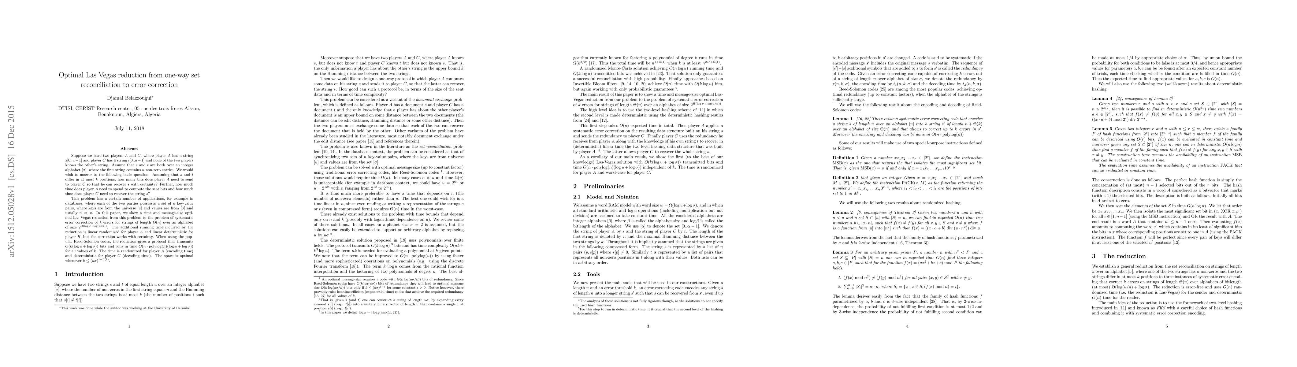 This research paper presents a time and message-size optimal Las Vegas reduction to systematic error correction for strings, reducing the problem of set reconciliation from one-way to two-way with certainty.