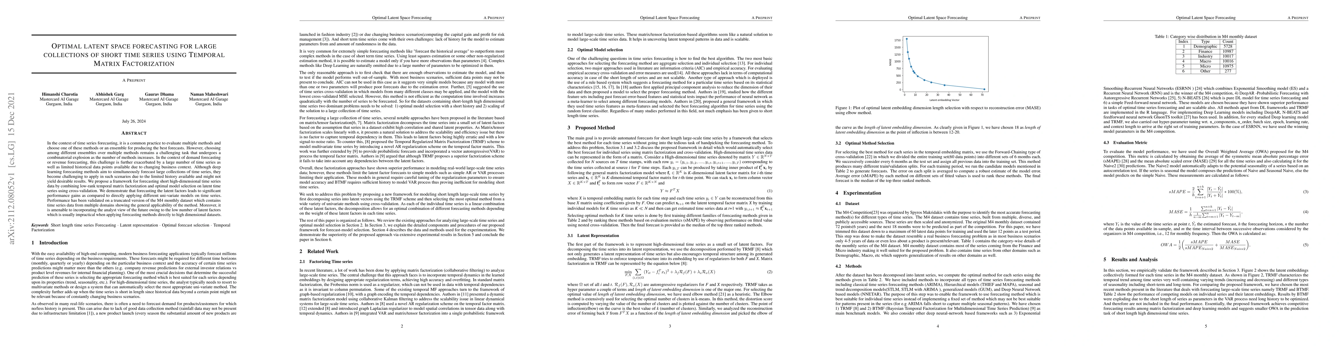 In the context of time series forecasting, it is a common practice to evaluate multiple methods and choose one of these methods or an ensemble for producing the best forecasts. However, choosing among different ensembles over multiple methods remains a challenging task that undergoes a combinatorial explosion as the number of methods increases. In the context of demand forecasting or revenue forecasting, this challenge is further exacerbated by a large number of time series as well as limited historical data points available due to changing business context. Although deep learning forecasting methods aim to simultaneously forecast large collections of time series, they become challenging to apply in such scenarios due to the limited history available and might not yield desirable results. We propose a framework for forecasting short high-dimensional time series data by combining low-rank temporal matrix factorization and optimal model selection on latent time series using cross-validation. We demonstrate that forecasting the latent factors leads to significant performance gains as compared to directly applying different uni-variate models on time series. Performance has been validated on a truncated version of the M4 monthly dataset which contains time series data from multiple domains showing the general applicability of the method. Moreover, it is amenable to incorporating the analyst view of the future owing to the low number of latent factors which is usually impractical when applying forecasting methods directly to high dimensional datasets.