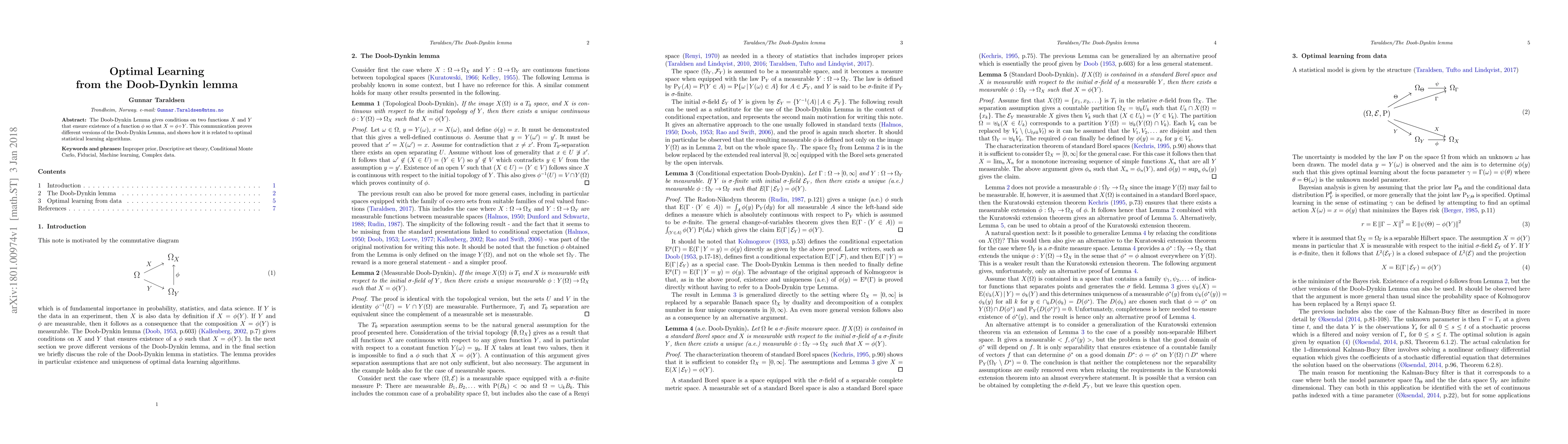 The Doob-Dynkin Lemma gives conditions on two functions $X$ and $Y$ that ensure existence of a function ${\phi}$ so that $X = {\phi} \circ Y$. This communication proves different versions of the Doob-Dynkin Lemma, and shows how it is related to optimal statistical learning algorithms. Keywords and phrases: Improper prior, Descriptive set theory, Conditional Monte Carlo, Fiducial, Machine learning, Complex data.