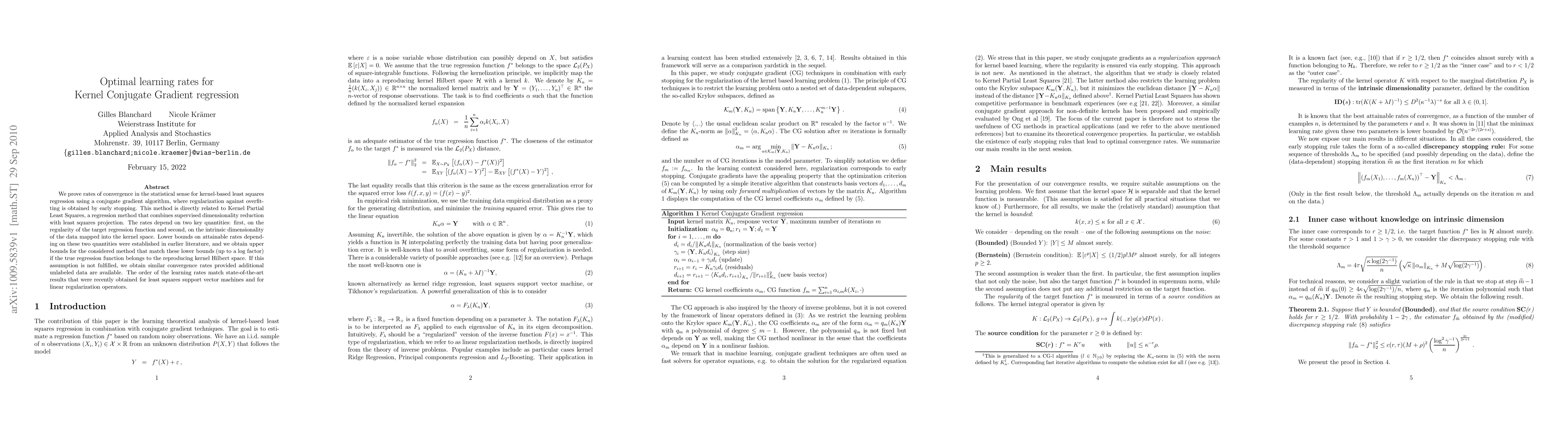 We prove rates of convergence in the statistical sense for kernel-based least squares regression using a conjugate gradient algorithm, where regularization against overfitting is obtained by early stopping. This method is directly related to Kernel Partial Least Squares, a regression method that combines supervised dimensionality reduction with least squares projection. The rates depend on two key quantities: first, on the regularity of the target regression function and second, on the intrinsic dimensionality of the data mapped into the kernel space. Lower bounds on attainable rates depending on these two quantities were established in earlier literature, and we obtain upper bounds for the considered method that match these lower bounds (up to a log factor) if the true regression function belongs to the reproducing kernel Hilbert space. If this assumption is not fulfilled, we obtain similar convergence rates provided additional unlabeled data are available. The order of the learning rates match state-of-the-art results that were recently obtained for least squares support vector machines and for linear regularization operators.