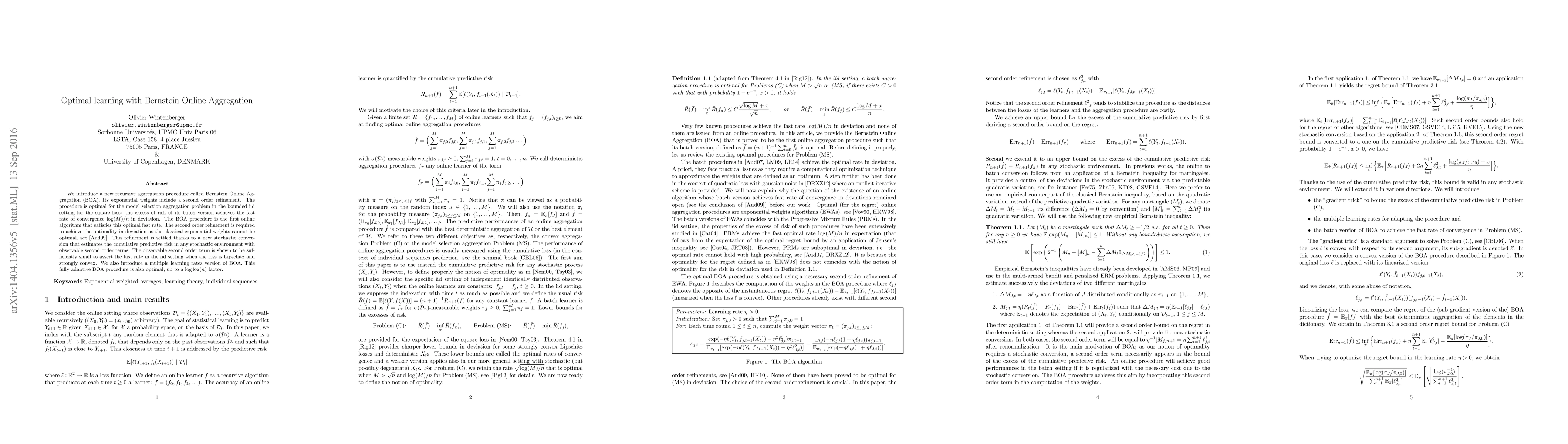 We introduce a new recursive aggregation procedure called Bernstein Online Aggregation (BOA). The exponential weights include an accuracy term and a second order term that is a proxy of the quadratic variation as in Hazan and Kale (2010). This second term stabilizes the procedure that is optimal in different senses. We first obtain optimal regret bounds in the deterministic context. Then, an adaptive version is the first exponential weights algorithm that exhibits a second order bound with excess losses that appears first in Gaillard et al. (2014). The second order bounds in the deterministic context are extended to a general stochastic context using the cumulative predictive risk. Such conversion provides the main result of the paper, an inequality of a novel type comparing the procedure with any deterministic aggregation procedure for an integrated criteria. Then we obtain an observable estimate of the excess of risk of the BOA procedure. To assert the optimality, we consider finally the iid case for strongly convex and Lipschitz continuous losses and we prove that the optimal rate of aggregation of Tsybakov (2003) is achieved. The batch version of the BOA procedure is then the first adaptive explicit algorithm that satisfies an optimal oracle inequality with high probability.