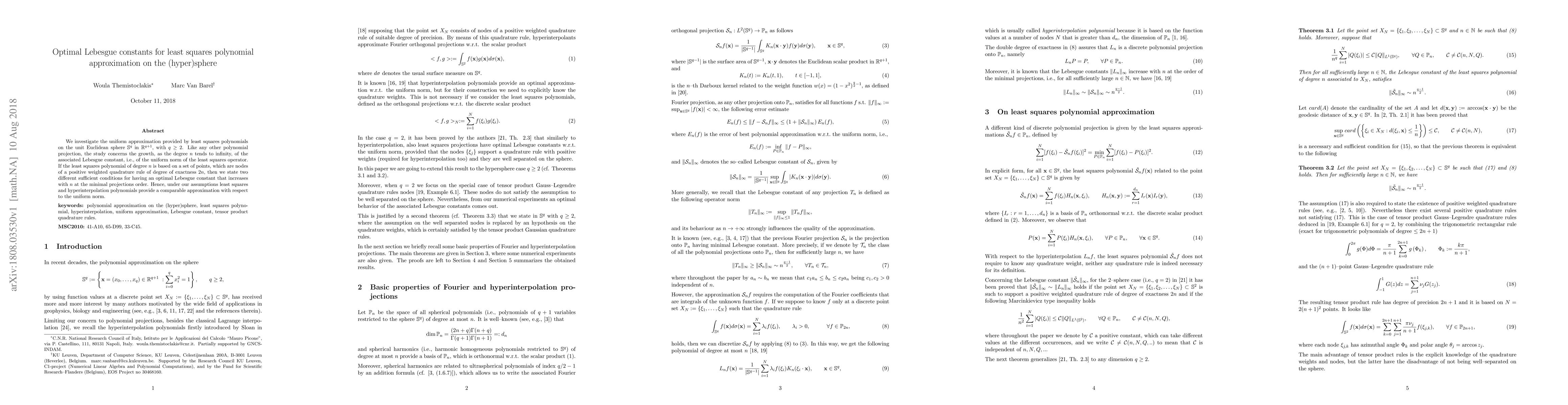 We investigate the uniform approximation provided by least squares polynomials on the unit Euclidean sphere $\mathbb{S}^q$ in $\mathbb{R}^{q+1}$, with $q\ge 2$. Like any other polynomial projection, the study concerns the growth, as the degree $n$ tends to infinity, of the associated Lebesgue constant, i.e., of the uniform norm of the least squares operator. If the least squares polynomial of degree $n$ is based on a set of points, which are nodes of a positive weighted quadrature rule of degree of exactness $2n$, then we state two different sufficient conditions for having an optimal Lebesgue constant that increases with $n$ at the minimal projections order. Hence, under our assumptions least squares and hyperinterpolation polynomials provide a comparable approximation with respect to the uniform norm.