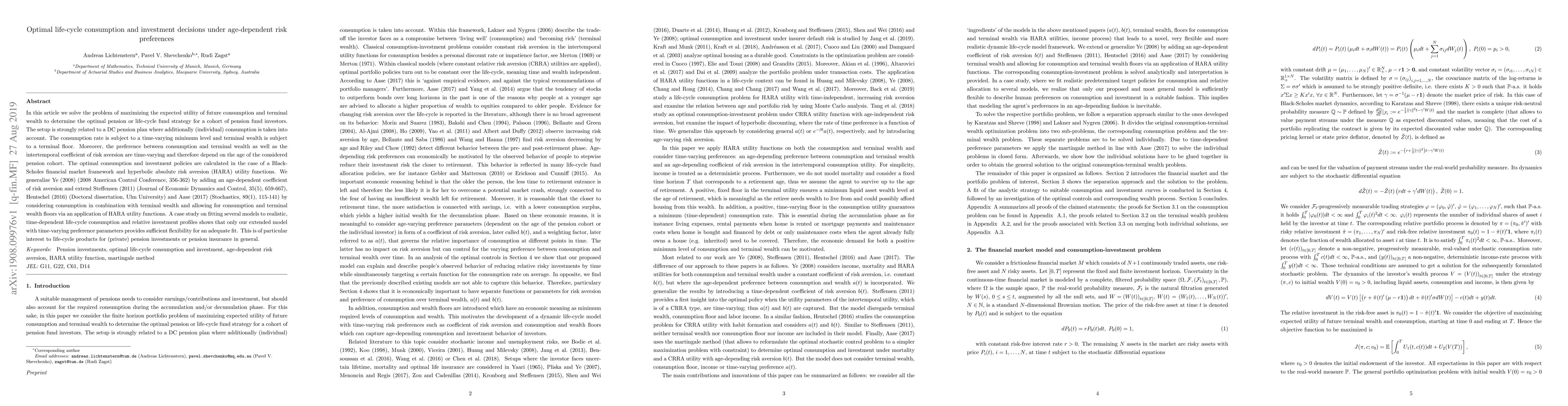 This paper develops optimal life-cycle consumption and investment strategies for pension fund investors under age-dependent risk preferences, extending previous models by incorporating time-varying risk aversion and consumption floors. The study finds that only the proposed model with flexible time-varying preference parameters can adequately fit realistic life-cycle consumption and investment profiles.