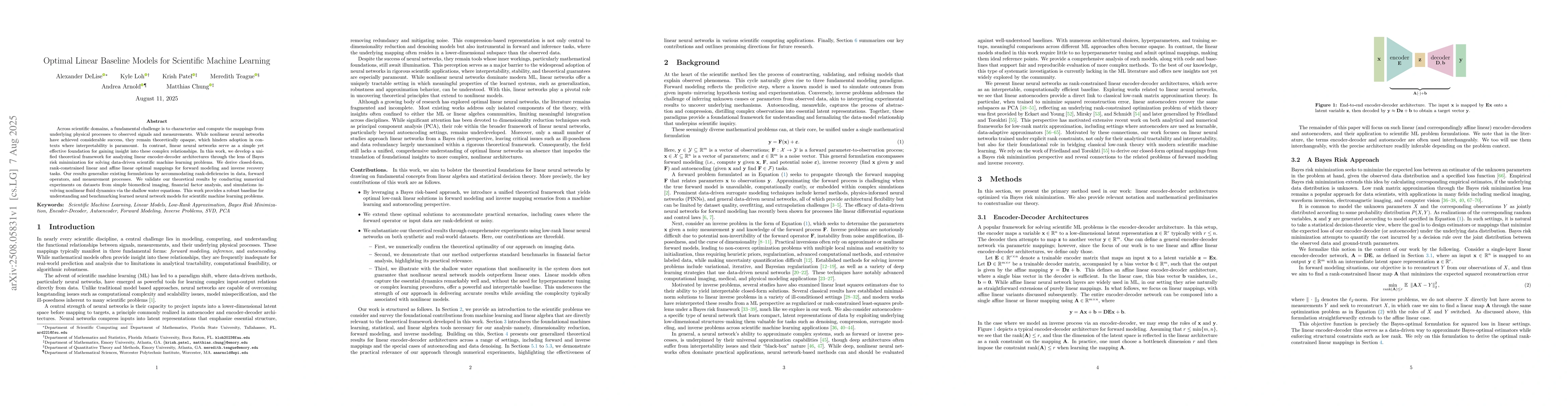 Across scientific domains, a fundamental challenge is to characterize and compute the mappings from underlying physical processes to observed signals and measurements. While nonlinear neural networks have achieved considerable success, they remain theoretically opaque, which hinders adoption in contexts where interpretability is paramount. In contrast, linear neural networks serve as a simple yet effective foundation for gaining insight into these complex relationships. In this work, we develop a unified theoretical framework for analyzing linear encoder-decoder architectures through the lens of Bayes risk minimization for solving data-driven scientific machine learning problems. We derive closed-form, rank-constrained linear and affine linear optimal mappings for forward modeling and inverse recovery tasks. Our results generalize existing formulations by accommodating rank-deficiencies in data, forward operators, and measurement processes. We validate our theoretical results by conducting numerical experiments on datasets from simple biomedical imaging, financial factor analysis, and simulations involving nonlinear fluid dynamics via the shallow water equations. This work provides a robust baseline for understanding and benchmarking learned neural network models for scientific machine learning problems.