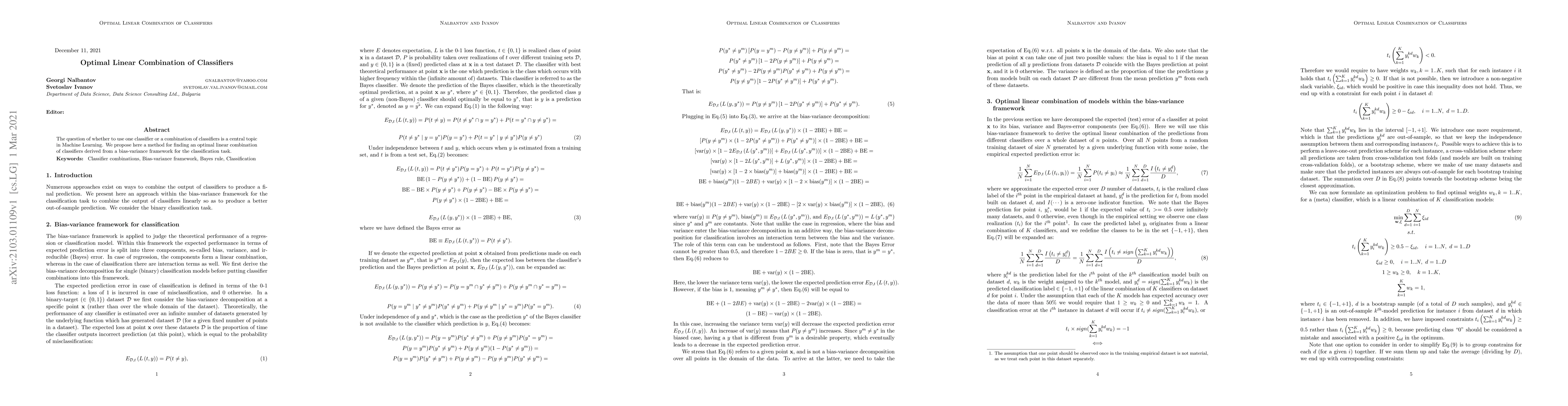 The question of whether to use one classifier or a combination of classifiers is a central topic in Machine Learning. We propose here a method for finding an optimal linear combination of classifiers derived from a bias-variance framework for the classification task.