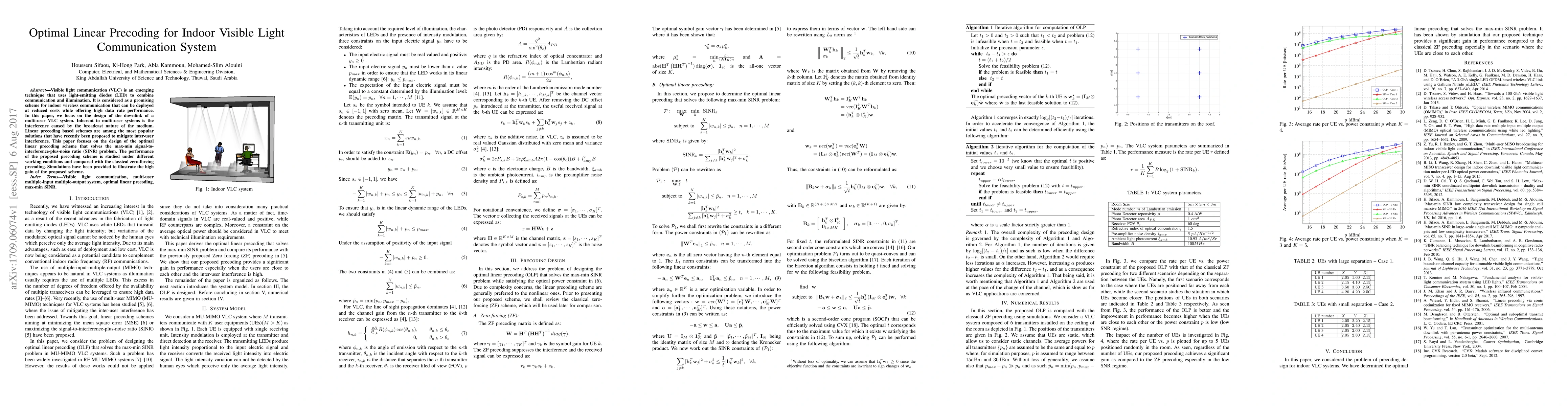 Visible light communication (VLC) is an emerging technique that uses light-emitting diodes (LED) to combine communication and illumination. It is considered as a promising scheme for indoor wireless communication that can be deployed at reduced costs while offering high data rate performance. In this paper, we focus on the design of the downlink of a multi-user VLC system. Inherent to multi-user systems is the interference caused by the broadcast nature of the medium. Linear precoding based schemes are among the most popular solutions that have recently been proposed to mitigate inter-user interference. This paper focuses on the design of the optimal linear precoding scheme that solves the max-min signal-to-interference-plus-noise ratio (SINR) problem. The performance of the proposed precoding scheme is studied under different working conditions and compared with the classical zero-forcing precoding. Simulations have been provided to illustrate the high gain of the proposed scheme.