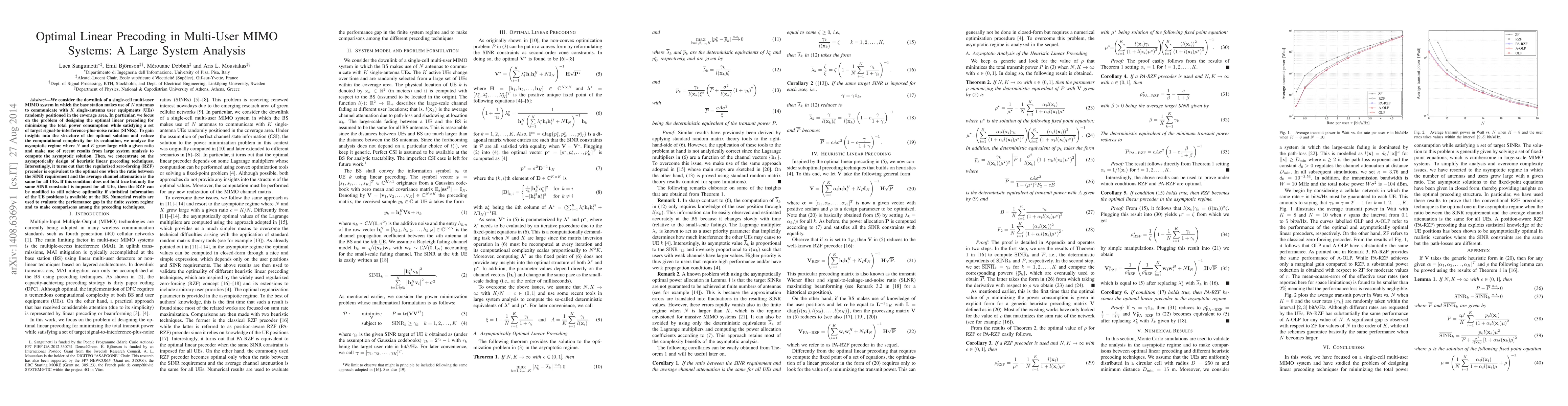 We consider the downlink of a single-cell multi-user MIMO system in which the base station makes use of $N$ antennas to communicate with $K$ single-antenna user equipments (UEs) randomly positioned in the coverage area. In particular, we focus on the problem of designing the optimal linear precoding for minimizing the total power consumption while satisfying a set of target signal-to-interference-plus-noise ratios (SINRs). To gain insights into the structure of the optimal solution and reduce the computational complexity for its evaluation, we analyze the asymptotic regime where $N$ and $K$ grow large with a given ratio and make use of recent results from large system analysis to compute the asymptotic solution. Then, we concentrate on the asymptotically design of heuristic linear precoding techniques. Interestingly, it turns out that the regularized zero-forcing (RZF) precoder is equivalent to the optimal one when the ratio between the SINR requirement and the average channel attenuation is the same for all UEs. If this condition does not hold true but only the same SINR constraint is imposed for all UEs, then the RZF can be modified to still achieve optimality if statistical information of the UE positions is available at the BS. Numerical results are used to evaluate the performance gap in the finite system regime and to make comparisons among the precoding techniques.