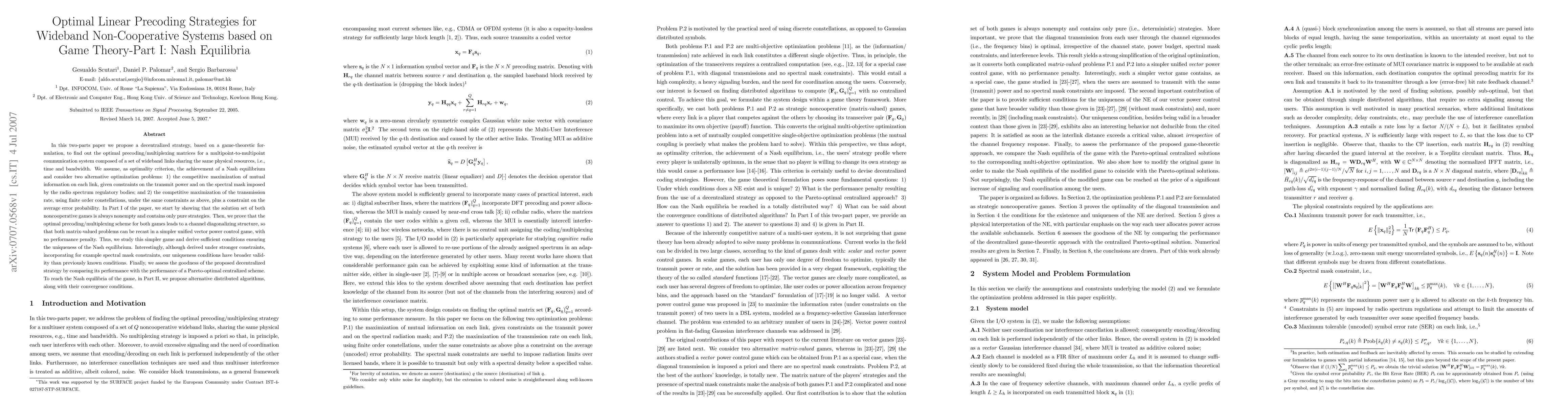 In this two-parts paper we propose a decentralized strategy, based on a game-theoretic formulation, to find out the optimal precoding/multiplexing matrices for a multipoint-to-multipoint communication system composed of a set of wideband links sharing the same physical resources, i.e., time and bandwidth. We assume, as optimality criterion, the achievement of a Nash equilibrium and consider two alternative optimization problems: 1) the competitive maximization of mutual information on each link, given constraints on the transmit power and on the spectral mask imposed by the radio spectrum regulatory bodies; and 2) the competitive maximization of the transmission rate, using finite order constellations, under the same constraints as above, plus a constraint on the average error probability. In Part I of the paper, we start by showing that the solution set of both noncooperative games is always nonempty and contains only pure strategies. Then, we prove that the optimal precoding/multiplexing scheme for both games leads to a channel diagonalizing structure, so that both matrix-valued problems can be recast in a simpler unified vector power control game, with no performance penalty. Thus, we study this simpler game and derive sufficient conditions ensuring the uniqueness of the Nash equilibrium. Interestingly, although derived under stronger constraints, incorporating for example spectral mask constraints, our uniqueness conditions have broader validity than previously known conditions. Finally, we assess the goodness of the proposed decentralized strategy by comparing its performance with the performance of a Pareto-optimal centralized scheme. To reach the Nash equilibria of the game, in Part II, we propose alternative distributed algorithms, along with their convergence conditions.