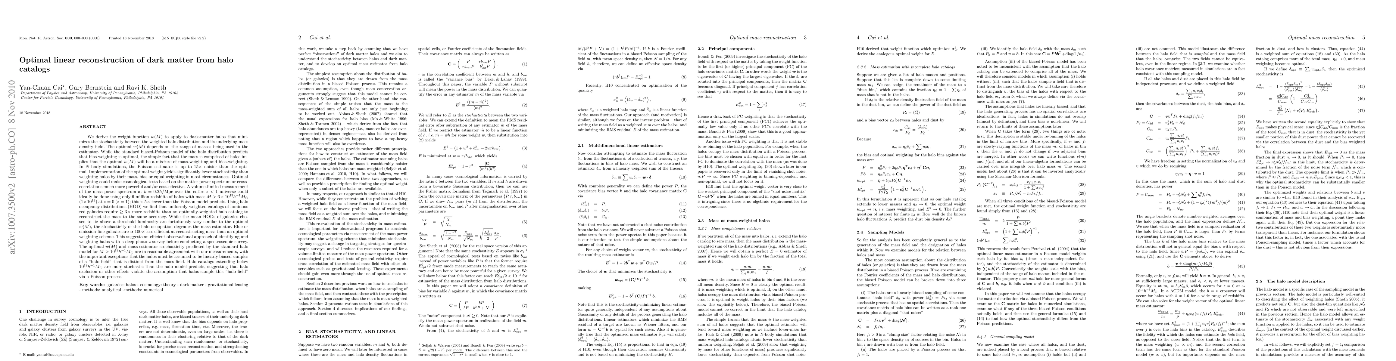 This paper develops an optimal weight function w(M) to minimize stochasticity in dark matter halo reconstructions, showing that it significantly reduces noise compared to traditional methods. The optimal weighting scheme can make cosmological tests more powerful and cost-effective, requiring fewer redshifts to achieve the same accuracy.