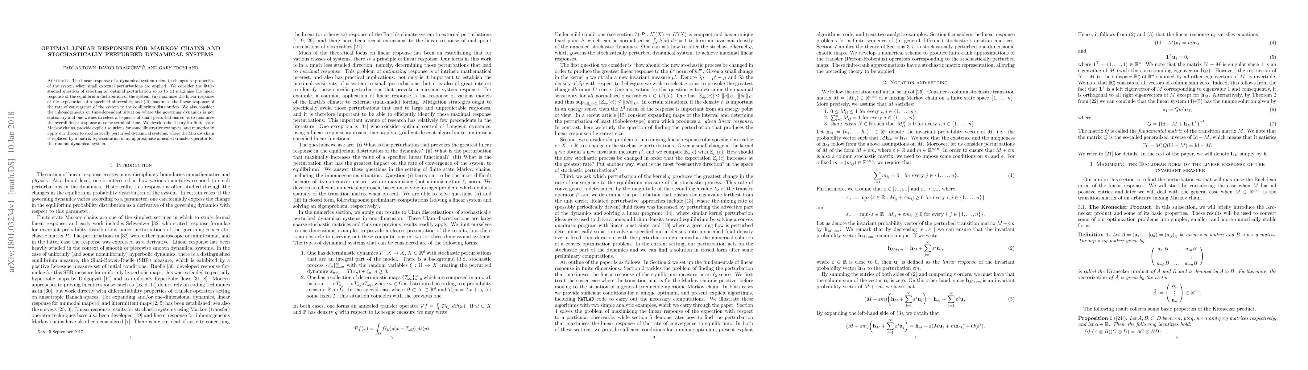 This paper develops a theory to optimize linear responses in Markov chains and stochastically perturbed dynamical systems by selecting perturbations that maximize responses in equilibrium distribution, observable expectations, and convergence rates. It also extends the approach to time-dependent systems and applies the theory to numerical examples.
