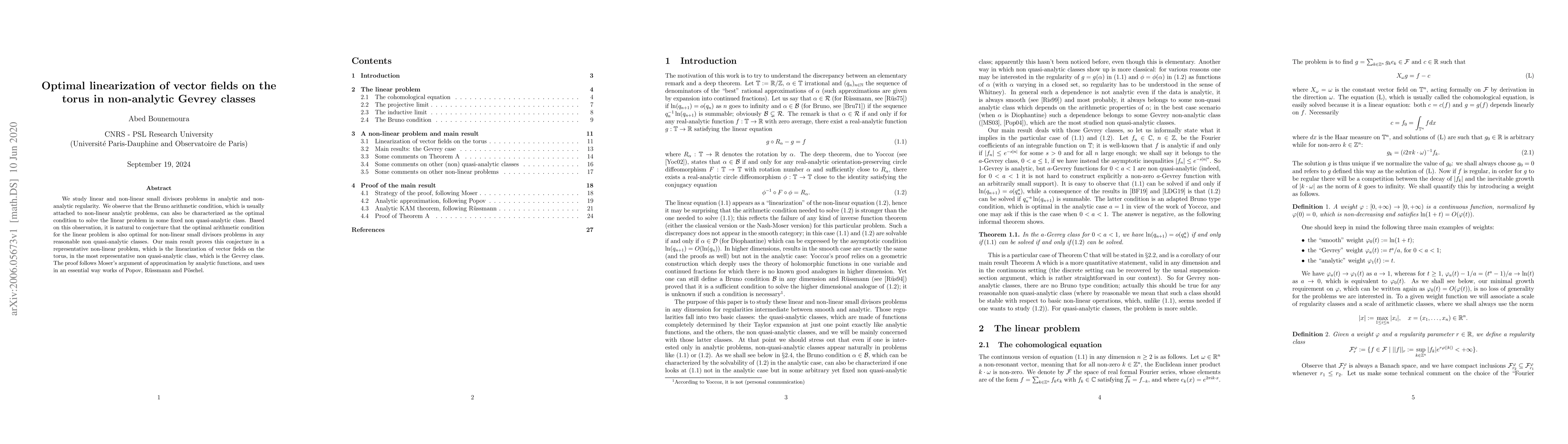 We study linear and non-linear small divisors problems in analytic and non-analytic regularity. We observe that the Bruno arithmetic condition, which is usually attached to non-linear analytic problems, can also be characterized as the optimal condition to solve the linear problem in some fixed non quasi-analytic class. Based on this observation, it is natural to conjecture that the optimal arithmetic condition for the linear problem is also optimal for non-linear small divisors problems in any reasonable non quasi-analytic classes. Our main result proves this conjecture in a representative non-linear problem, which is the linearization of vector fields on the torus, in the most representative non quasi-analytic class, which is the Gevrey class. The proof follows Moser's argument of approximation by analytic functions, and uses in an essential way works of Popov, R\"{u}ssmann and P\"{o}schel.