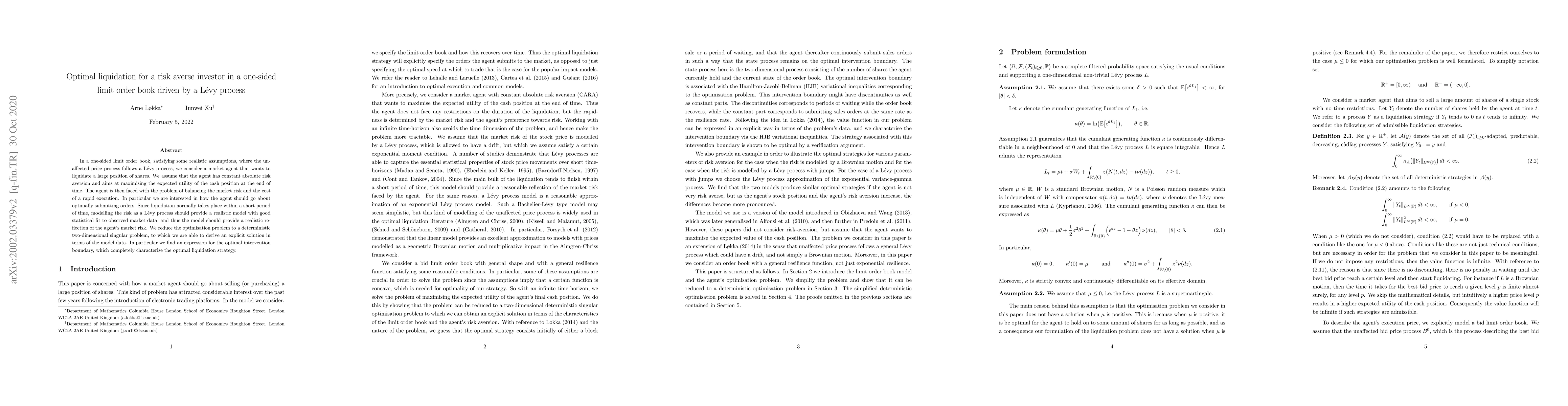 In a one-sided limit order book, satisfying some realistic assumptions, where the unaffected price process follows a Levy process, we consider a market agent that wants to liquidate a large position of shares. We assume that the agent has constant absolute risk aversion and aims at maximising the expected utility of the cash position at the end of time. The agent is then faced with the problem of balancing the market risk and the cost of a rapid execution. In particular we are interested in how the agent should go about optimally submitting orders. Since liquidation normally takes place within a short period of time, modelling the risk as a Levy process should provide a realistic model with good statistical fit to observed market data, and thus the model should provide a realistic reflection of the agent's market risk. We reduce the optimisation problem to a deterministic two-dimensional singular problem, to which we are able to derive an explicit solution in terms of the model data. In particular we find an expression for the optimal intervention boundary, which completely characterise the optimal liquidation strategy.