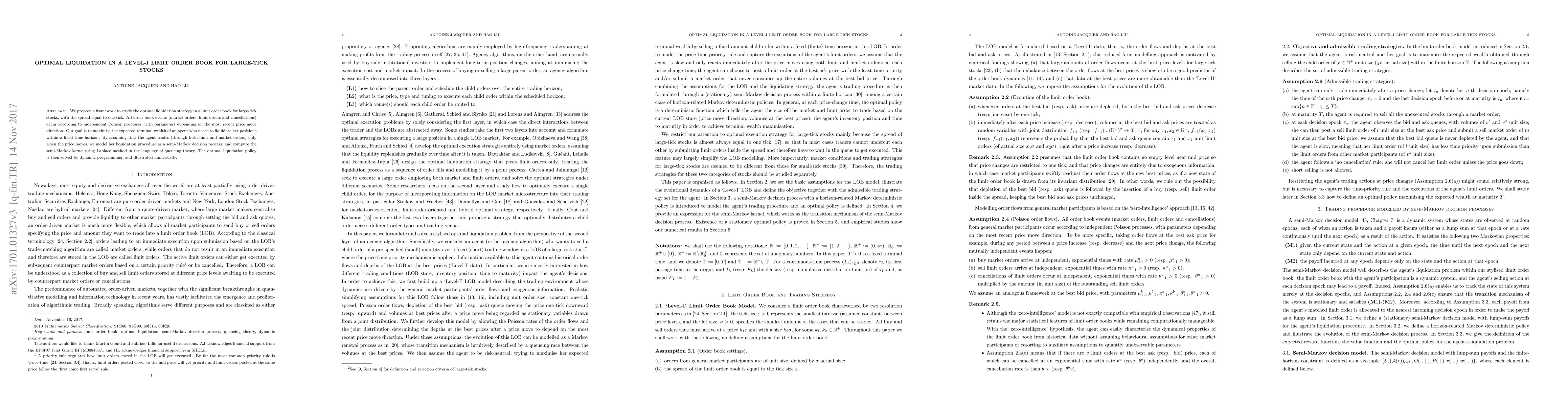 Researchers developed a framework to optimize liquidation strategies in limit order books for large-tick stocks, aiming to maximize expected terminal wealth within a fixed time horizon.