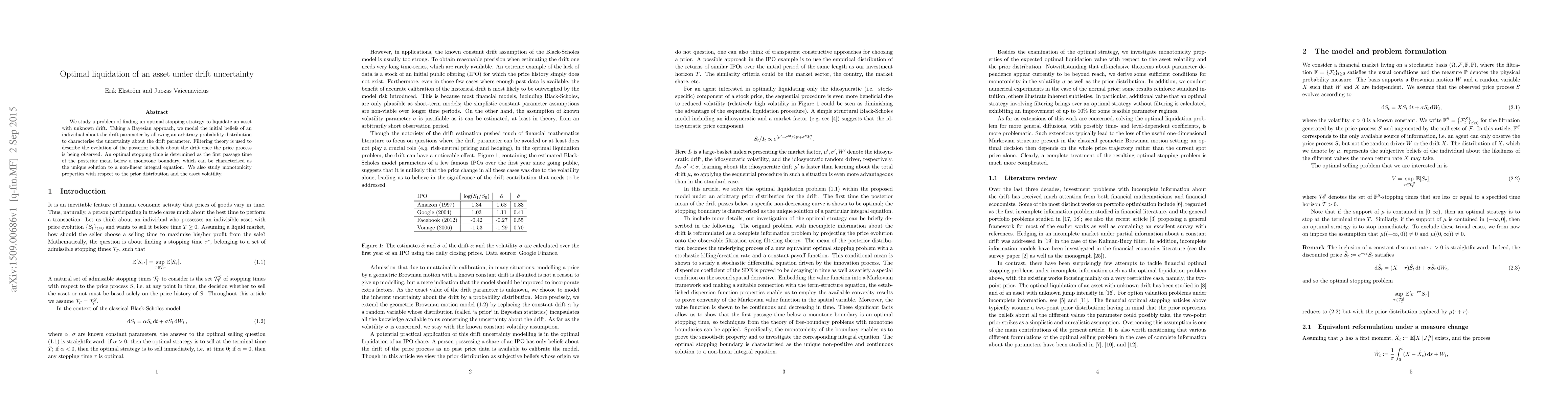 This paper investigates the optimal liquidation strategy for an asset with uncertain drift, employing a Bayesian approach to model initial beliefs about the drift parameter. It uses filtering theory to update beliefs based on observed price processes and determines an optimal stopping time as the first passage time below a boundary, characterized by a non-linear integral equation.