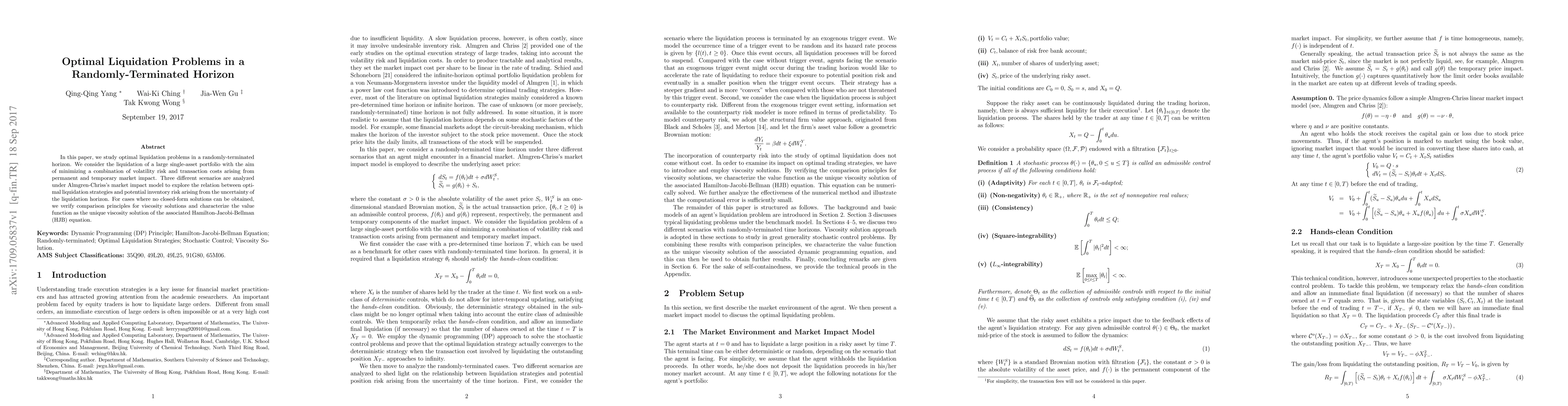 The paper employs Almgren-Chriss's market impact model to study optimal liquidation problems in a randomly-terminated horizon, relaxing the assumption of a known pre-determined liquidation time.