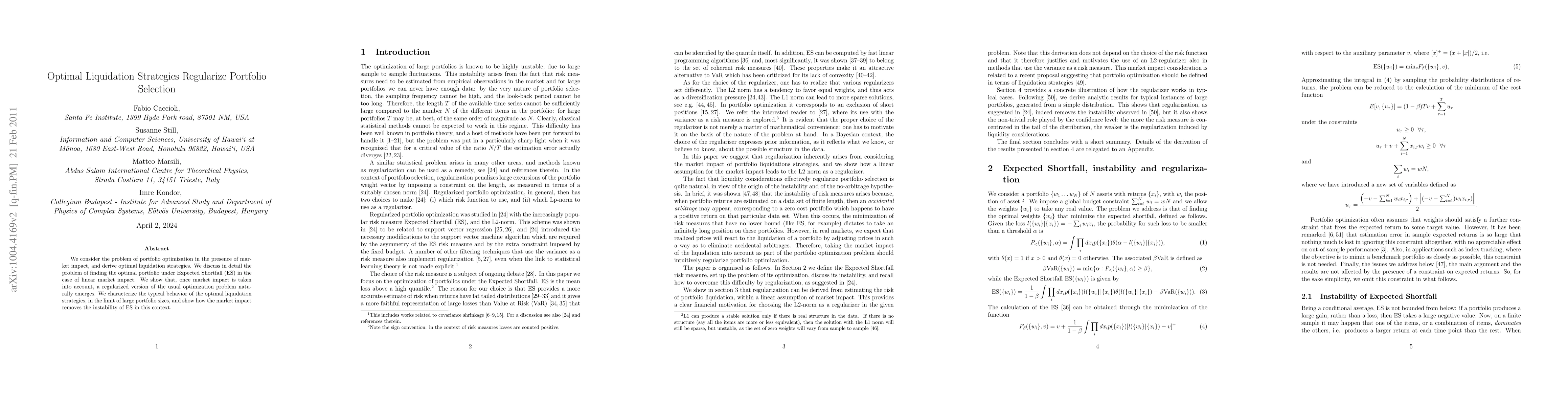 This paper derives optimal liquidation strategies for portfolio optimization under market impact, demonstrating that accounting for market impact leads to a regularized optimization problem. It characterizes the behavior of these strategies for large portfolios, showing that market impact mitigates the instability of Expected Shortfall.