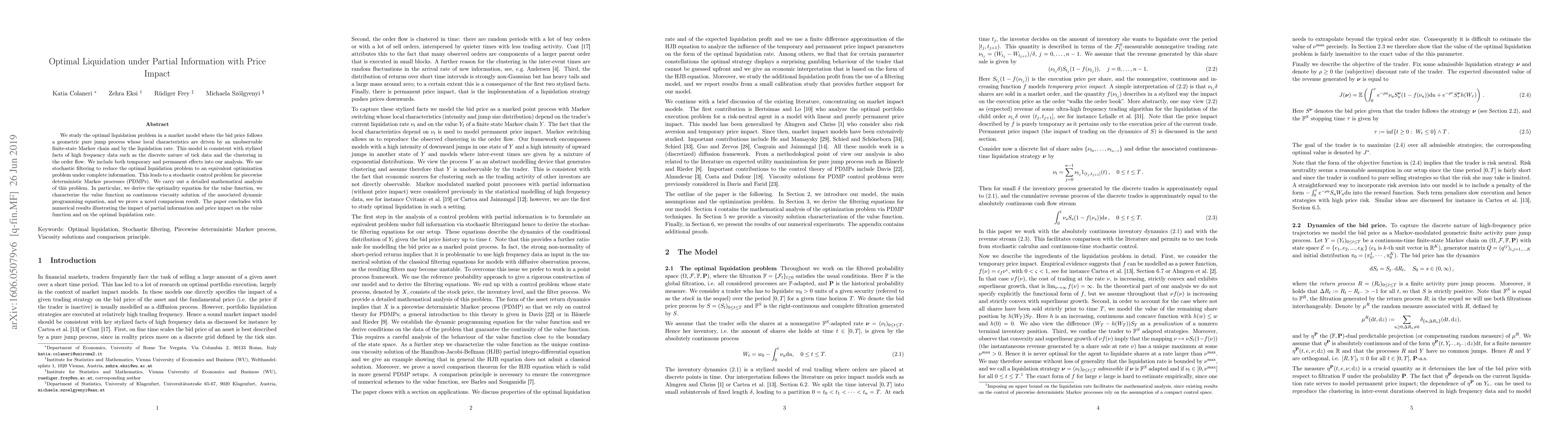 This paper investigates optimal liquidation strategies under partial information and price impact in a high-frequency market model. It employs stochastic filtering to transform the problem into a stochastic control framework for piecewise deterministic Markov processes, deriving a value function and proving a comparison result. Numerical results demonstrate the effects of partial information and price impact on liquidation strategies.