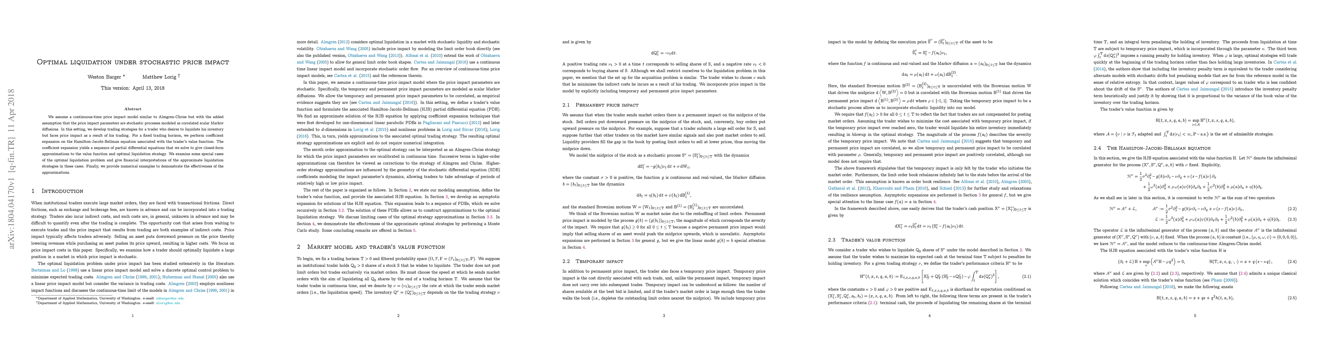 We assume a continuous-time price impact model similar to Almgren-Chriss but with the added assumption that the price impact parameters are stochastic processes modeled as correlated scalar Markov diffusions. In this setting, we develop trading strategies for a trader who desires to liquidate his inventory but faces price impact as a result of his trading. For a fixed trading horizon, we perform coefficient expansion on the Hamilton-Jacobi-Bellman equation associated with the trader's value function. The coefficient expansion yields a sequence of partial differential equations that we solve to give closed-form approximations to the value function and optimal liquidation strategy. We examine some special cases of the optimal liquidation problem and give financial interpretations of the approximate liquidation strategies in these cases. Finally, we provide numerical examples to demonstrate the effectiveness of the approximations.