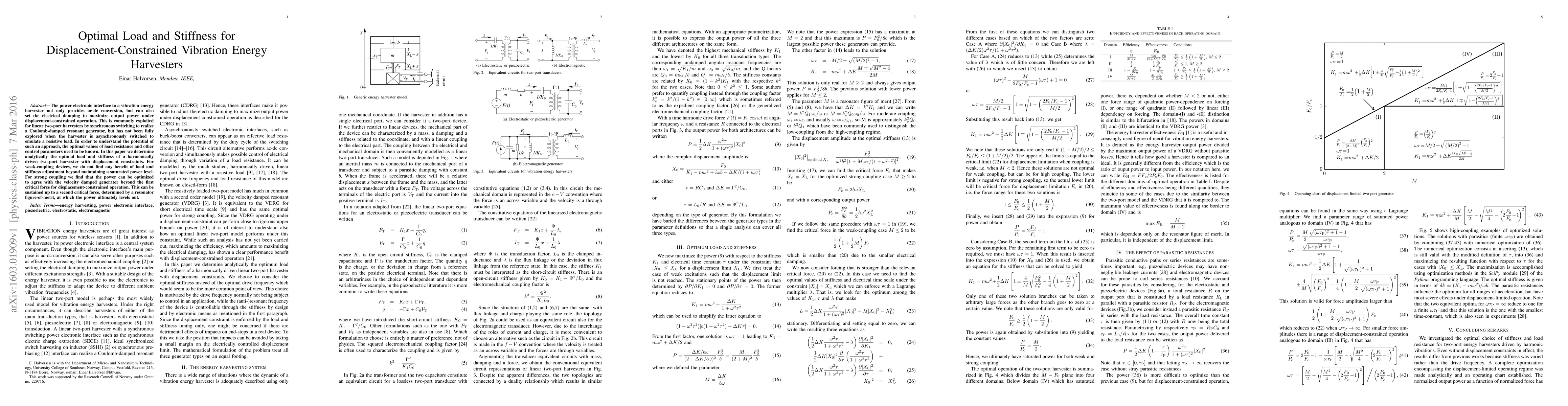This paper analyzes displacement-constrained vibration energy harvesters, finding optimal load resistance and stiffness for maximizing power output. For weak-coupling devices, adjusting load and stiffness offers no additional power gain beyond a saturated level. Strong-coupling devices, however, can achieve power levels comparable to velocity-damped generators, sustained up to a critical force determined by a resonator figure-of-merit.
