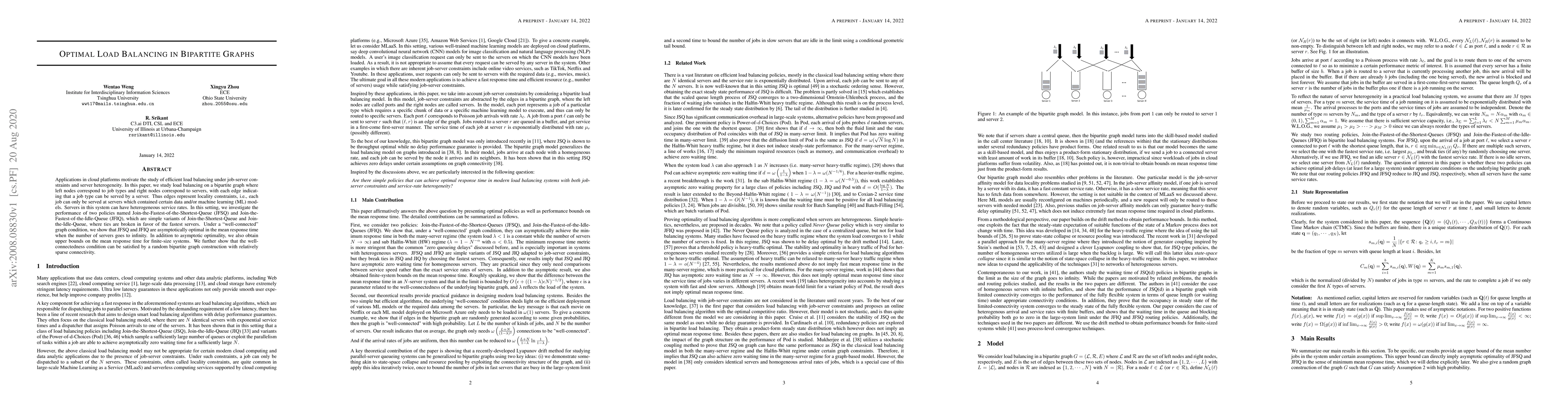 This paper studies load balancing in bipartite graphs representing job-server systems with heterogeneous service rates, focusing on two policies: JFSQ and JFIQ. It demonstrates asymptotic optimality of these policies under a well-connected graph condition and provides upper bounds for finite systems.