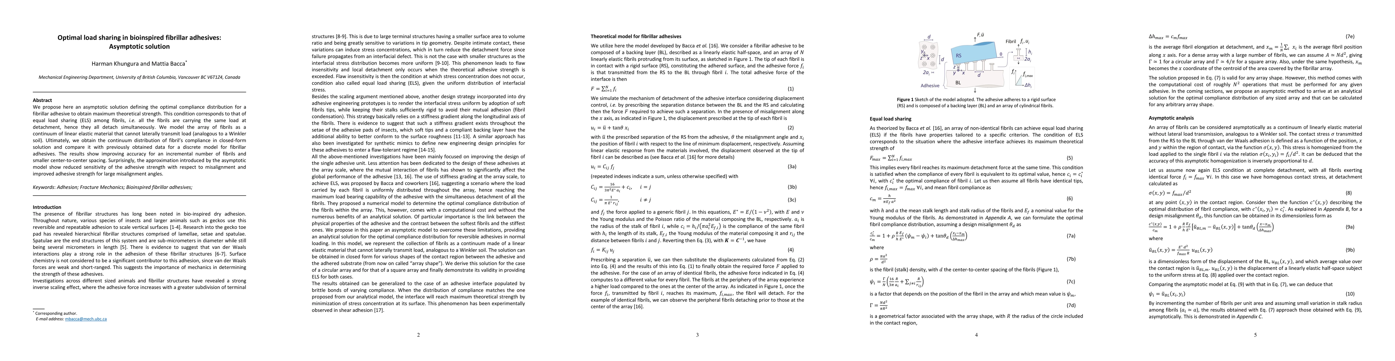 Researchers developed an asymptotic model for optimal load sharing in bioinspired fibrillar adhesives, finding that equal load sharing among fibers improves adhesive strength and reduces sensitivity to misalignment.