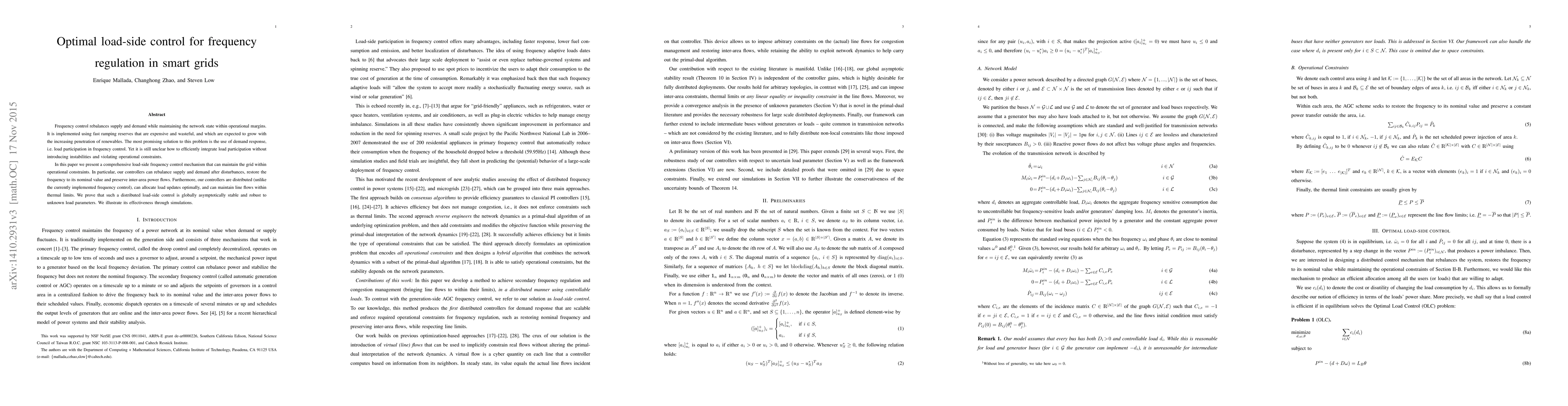 Frequency control rebalances supply and demand while maintaining the network state within operational margins. It is implemented using fast ramping reserves that are expensive and wasteful, and which are expected to grow with the increasing penetration of renewables. The most promising solution to this problem is the use of demand response, i.e. load participation in frequency control. Yet it is still unclear how to efficiently integrate load participation without introducing instabilities and violating operational constraints. In this paper we present a comprehensive load-side frequency control mechanism that can maintain the grid within operational constraints. In particular, our controllers can rebalance supply and demand after disturbances, restore the frequency to its nominal value and preserve inter-area power flows. Furthermore, our controllers are distributed (unlike the currently implemented frequency control), can allocate load updates optimally, and can maintain line flows within thermal limits. We prove that such a distributed load-side control is globally asymptotically stable and robust to unknown load parameters. We illustrate its effectiveness through simulations.