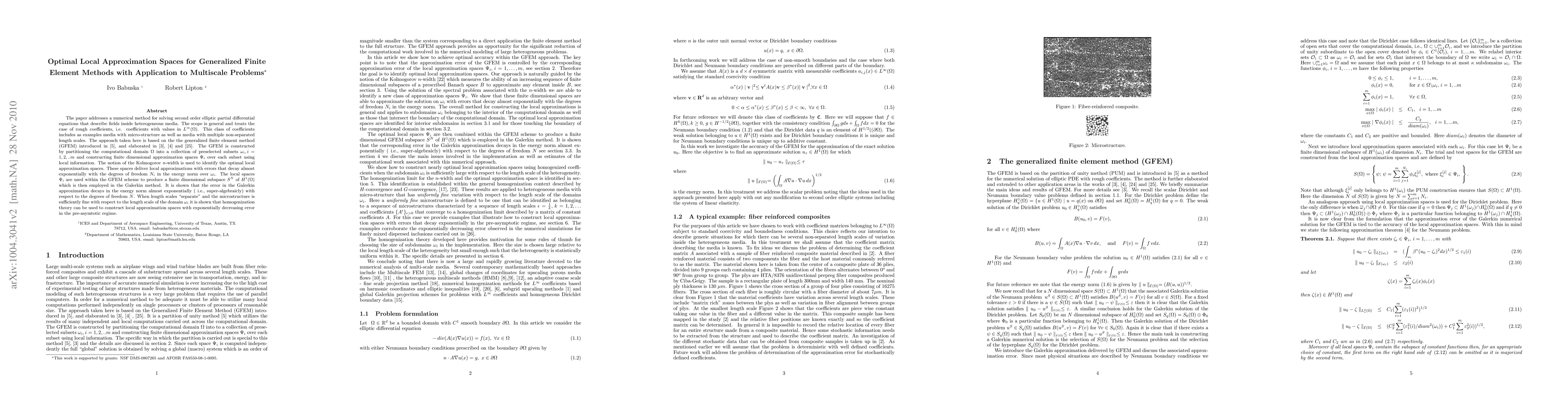 The paper addresses a numerical method for solving second order elliptic partial differential equations that describe fields inside heterogeneous media. The scope is general and treats the case of rough coefficients, i.e. coefficients with values in $L^\infty(\Omega)$. This class of coefficients includes as examples media with micro-structure as well as media with multiple non-separated length scales. The approach taken here is based on the the generalized finite element method (GFEM) introduced in \cite{107}, and elaborated in \cite{102}, \cite{103} and \cite{104}. The GFEM is constructed by partitioning the computational domain $\Omega$ into to a collection of preselected subsets $\omega_{i},i=1,2,..m$ and constructing finite dimensional approximation spaces $\Psi_{i}$ over each subset using local information. The notion of the Kolmogorov $n$-width is used to identify the optimal local approximation spaces. These spaces deliver local approximations with errors that decay almost exponentially with the degrees of freedom $N_{i}$ in the energy norm over $\omega_i$. The local spaces $% \Psi_{i}$ are used within the GFEM scheme to produce a finite dimensional subspace $S^N$ of $H^{1}(\Omega)$ which is then employed in the Galerkin method. It is shown that the error in the Galerkin approximation decays in the energy norm almost exponentially (i.e., super-algebraicly) with respect to the degrees of freedom $N$. When length scales "`separate" and the microstructure is sufficiently fine with respect to the length scale of the domain $\omega_i$ it is shown that homogenization theory can be used to construct local approximation spaces with exponentially decreasing error in the pre-asymtotic regime.