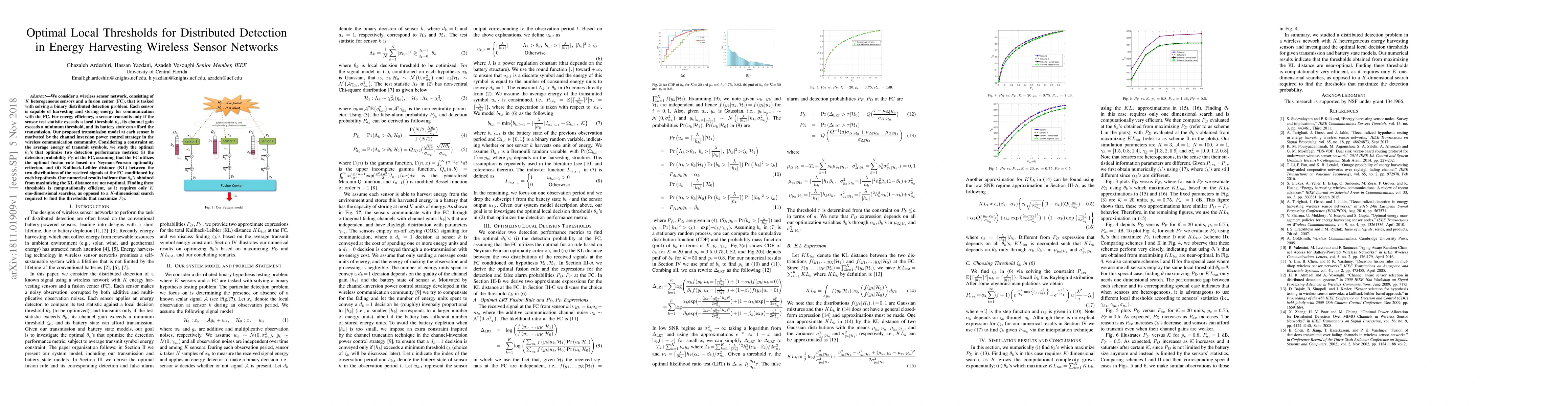 This paper proposes optimal local thresholds for energy-harvesting wireless sensor networks to enhance distributed detection efficiency. It finds thresholds that maximize detection probability and Kullback-Leibler distance, showing that maximizing KL distance yields near-optimal results with efficient K one-dimensional searches.