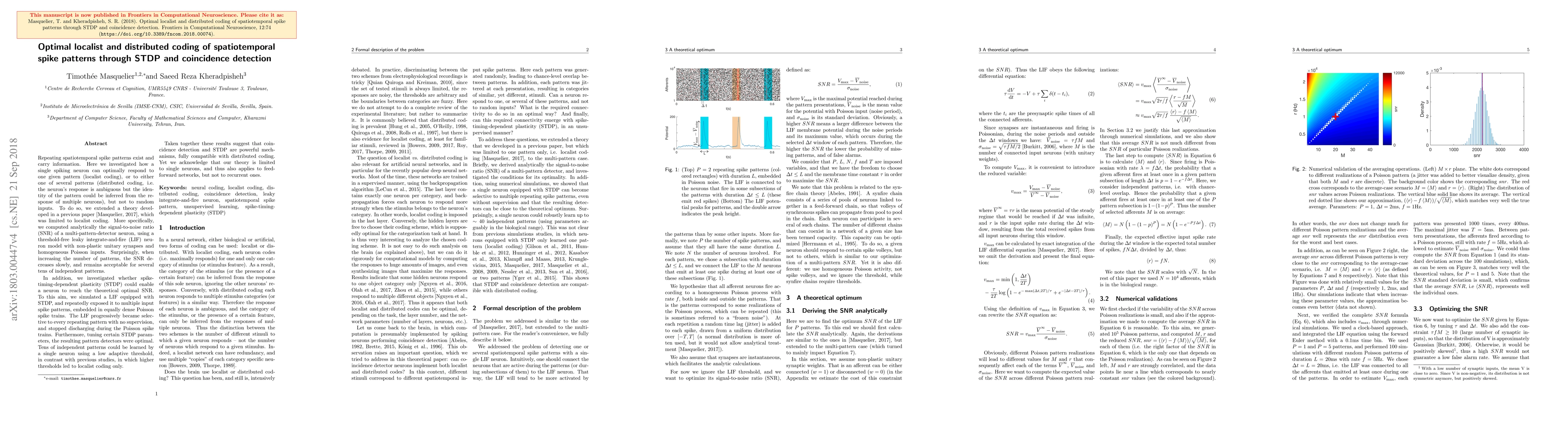 This paper investigates how a spiking neuron can optimally encode and respond to spatiotemporal spike patterns through localist or distributed coding using STDP and coincidence detection. The study finds that a neuron can learn to detect multiple patterns without supervision, maintaining an acceptable signal-to-noise ratio for tens of independent patterns, and that STDP enables the neuron to reach optimal performance.