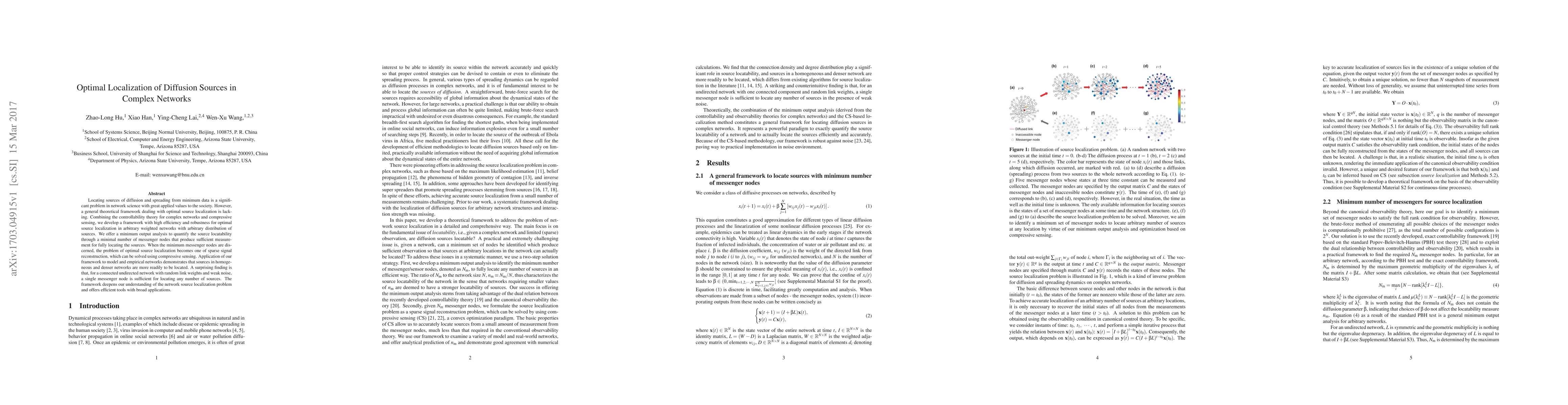 Locating sources of diffusion and spreading from minimum data is a significant problem in network science with great applied values to the society. However, a general theoretical framework dealing with optimal source localization is lacking. Combining the controllability theory for complex networks and compressive sensing, we develop a framework with high efficiency and robustness for optimal source localization in arbitrary weighted networks with arbitrary distribution of sources. We offer a minimum output analysis to quantify the source locatability through a minimal number of messenger nodes that produce sufficient measurement for fully locating the sources. When the minimum messenger nodes are discerned, the problem of optimal source localization becomes one of sparse signal reconstruction, which can be solved using compressive sensing. Application of our framework to model and empirical networks demonstrates that sources in homogeneous and denser networks are more readily to be located. A surprising finding is that, for a connected undirected network with random link weights and weak noise, a single messenger node is sufficient for locating any number of sources. The framework deepens our understanding of the network source localization problem and offers efficient tools with broad applications.