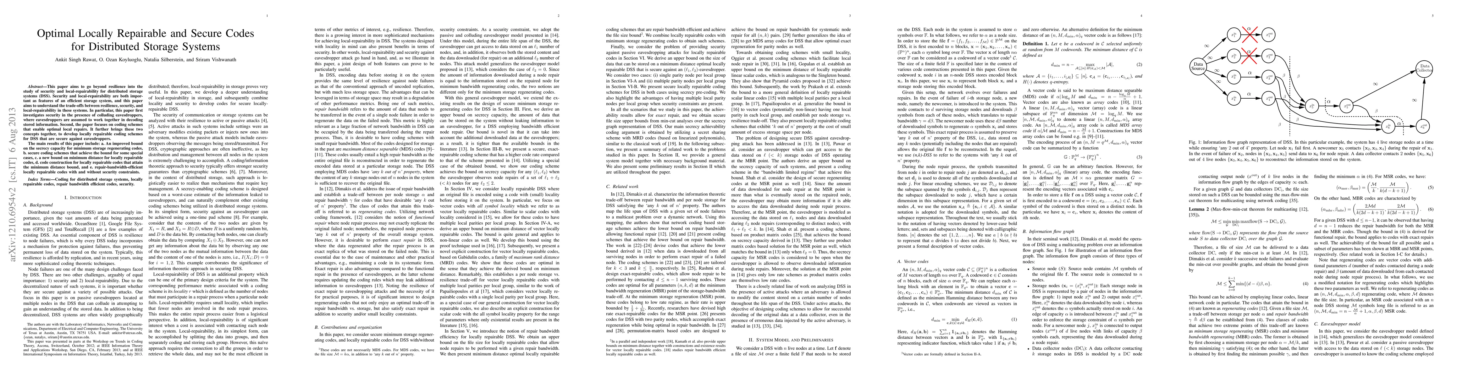 This paper explores optimal coding schemes for distributed storage systems that balance security against eavesdroppers and local-repairability. It establishes new bounds on secrecy capacity and minimum distance for secure, locally repairable codes, and proposes constructions achieving these bounds.