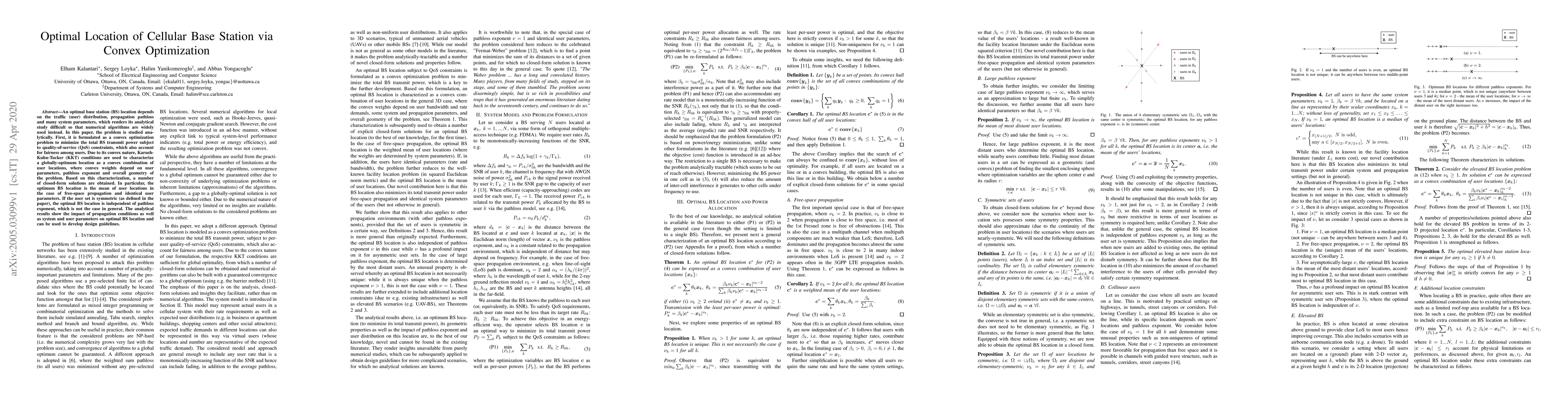 This paper formulates the optimal cellular base station location as a convex optimization problem to minimize transmit power, considering QoS constraints and fairness. Analytical results reveal that the optimal BS location is a convex combination of user locations, with specific closed-form solutions depending on propagation conditions and system parameters.