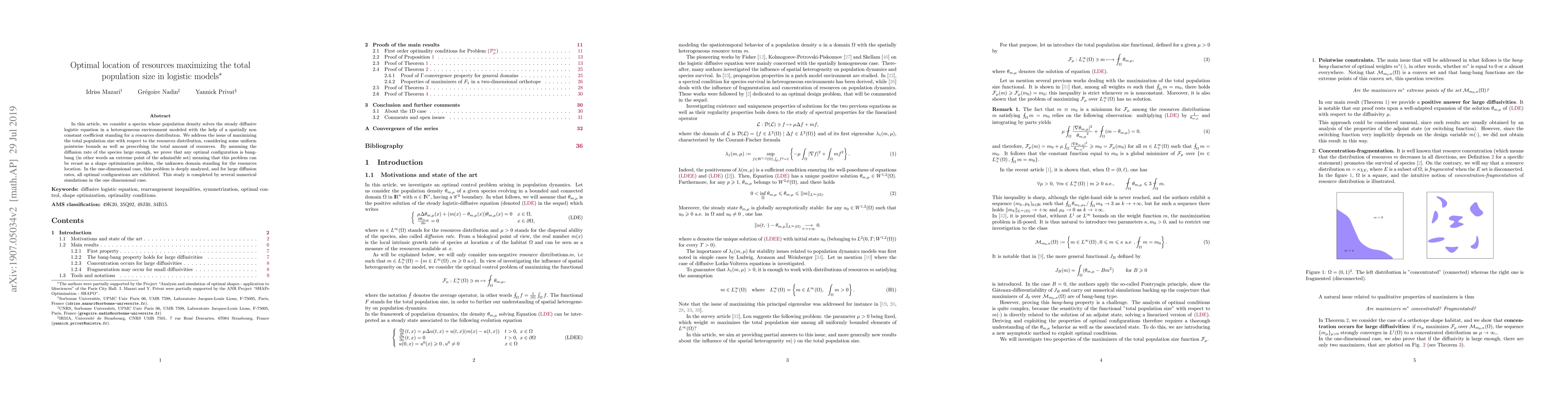 In this article, we consider a species whose population density solves the steady diffusive logistic equation in a heterogeneous environment modeled with the help of a spatially non constant coefficient standing for a resources distribution. We address the issue of maximizing the total population size with respect to the resources distribution, considering some uniform pointwise bounds as well as prescribing the total amount of resources. By assuming the diffusion rate of the species large enough, we prove that any optimal configuration is bang-bang (in other words an extreme point of the admissible set) meaning that this problem can be recast as a shape optimization problem, the unknown domain standing for the resources location. In the one-dimensional case, this problem is deeply analyzed, and for large diffusion rates, all optimal configurations are exhibited. This study is completed by several numerical simulations in the one dimensional case.