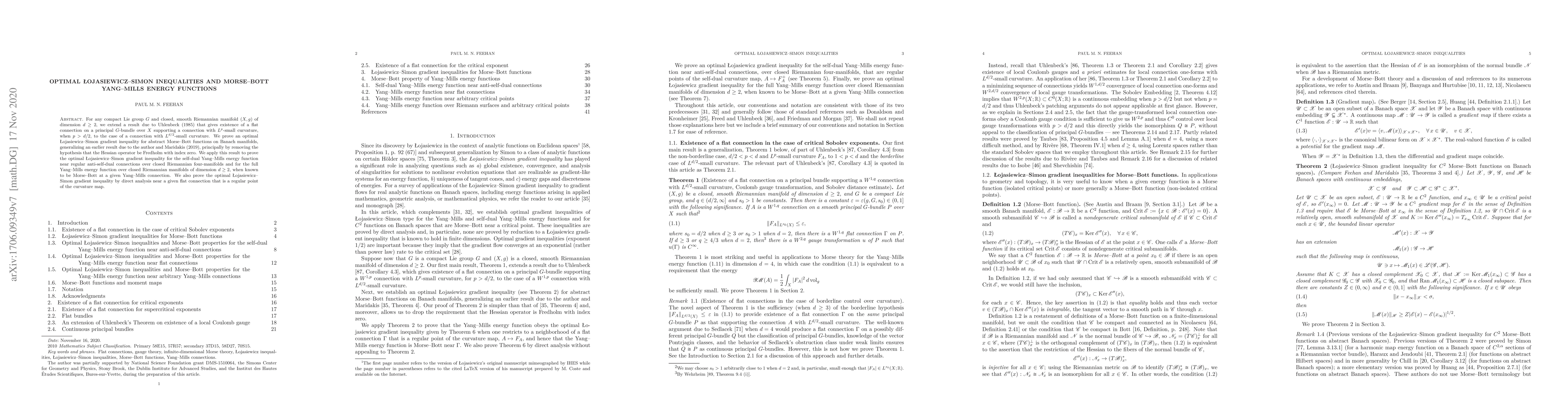 This paper extends Uhlenbeck's result on the existence of flat connections with $L^p$-small curvature to $L^{d/2}$-small curvature for any compact Lie group $G$ over a smooth Riemannian manifold. It proves optimal Lojasiewicz-Simon gradient inequalities for Morse-Bott functions on Banach manifolds and applies these to the self-dual Yang-Mills energy function, proving the Morse-Bott property for irreducible Yang-Mills $U(n)$ connections over Riemann surfaces.