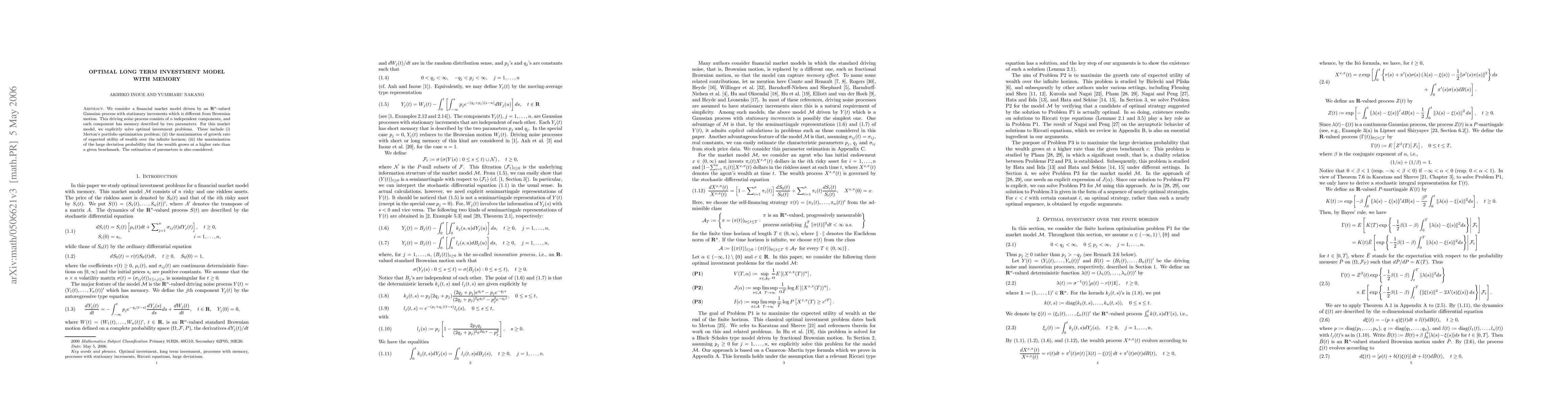 Researchers develop an optimal long-term investment model that incorporates memory into a financial market driven by a Gaussian process with stationary increments. The model aims to maximize growth rate of wealth, minimize risk, and estimate parameters.