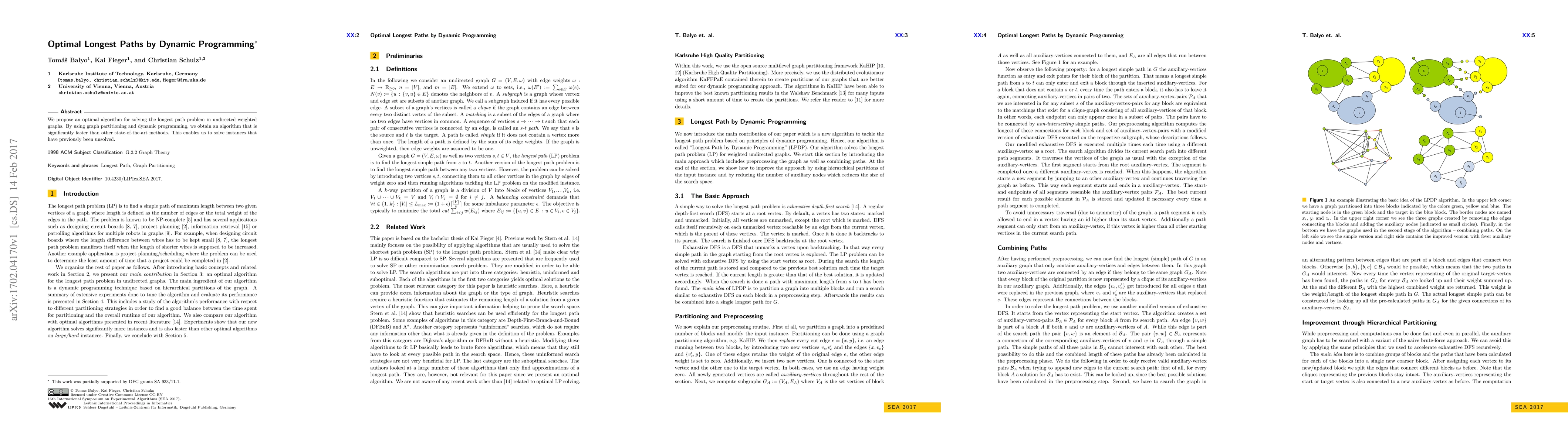Summary: This paper presents an optimal algorithm for the longest path problem in undirected weighted graphs, leveraging graph partitioning and dynamic programming to achieve faster computation and solve previously unsolvable instances.