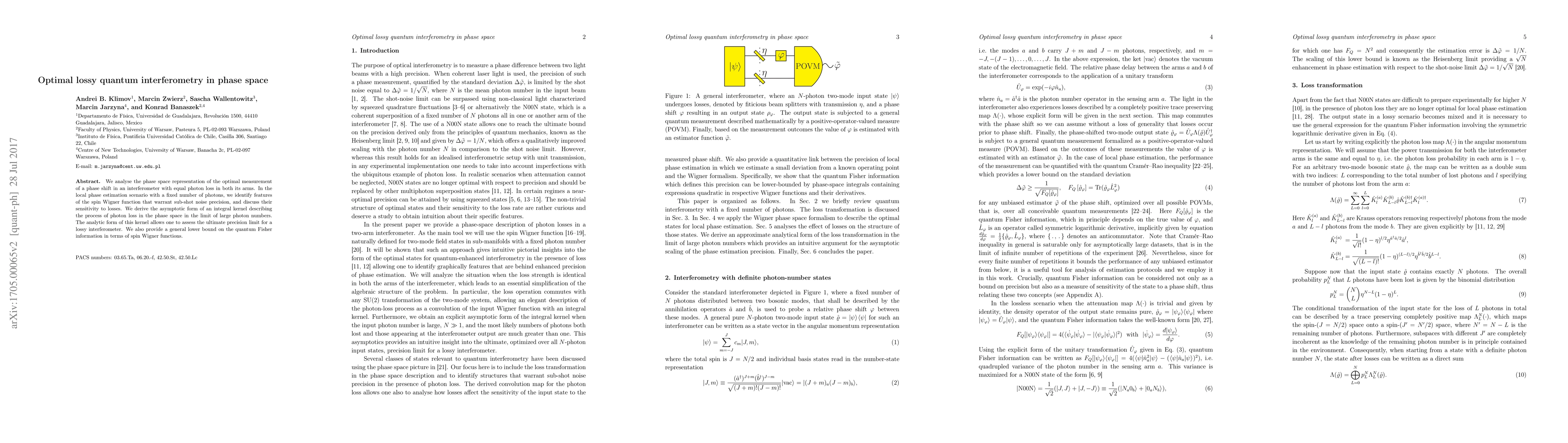 We analyse the phase space representation of the optimal measurement of a phase shift in an interferometer with equal photon loss in both its arms. In the local phase estimation scenario with a fixed number of photons, we identify features of the spin Wigner function that warrant sub-shot noise precision, and discuss their sensitivity to losses. We derive the asymptotic form of an integral kernel describing the process of photon loss in the phase space in the limit of large photon numbers. The analytic form of this kernel allows one to assess the ultimate precision limit for a lossy interferometer. We also provide a general lower bound on the quantum Fisher information in terms of spin Wigner functions.