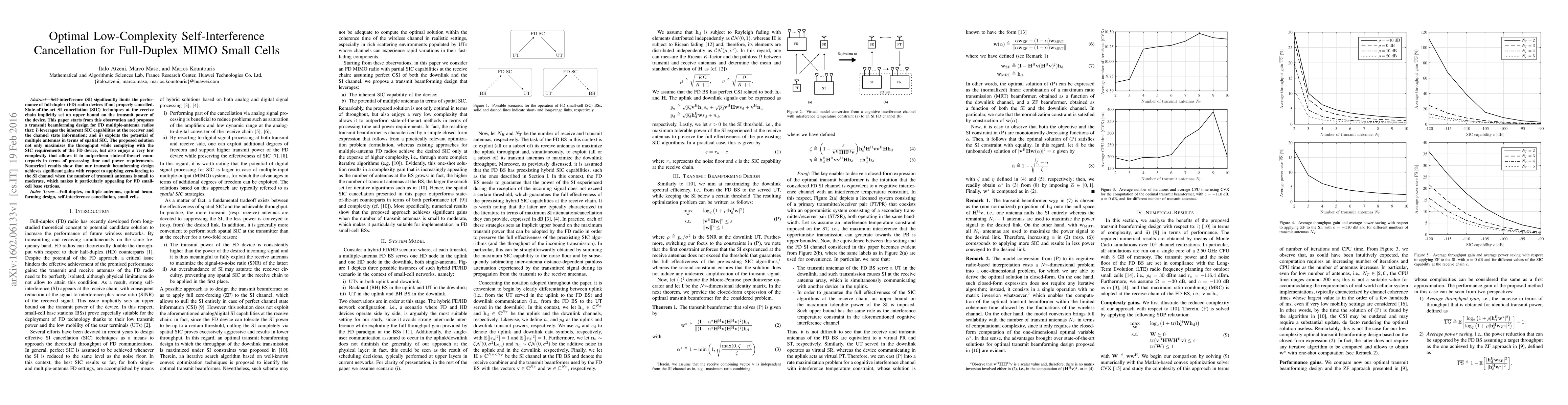 This paper proposes a low-complexity self-interference cancellation method for full-duplex MIMO small cells that leverages channel state information and exploits multiple antennas to maximize throughput while minimizing processing time and power requirements.